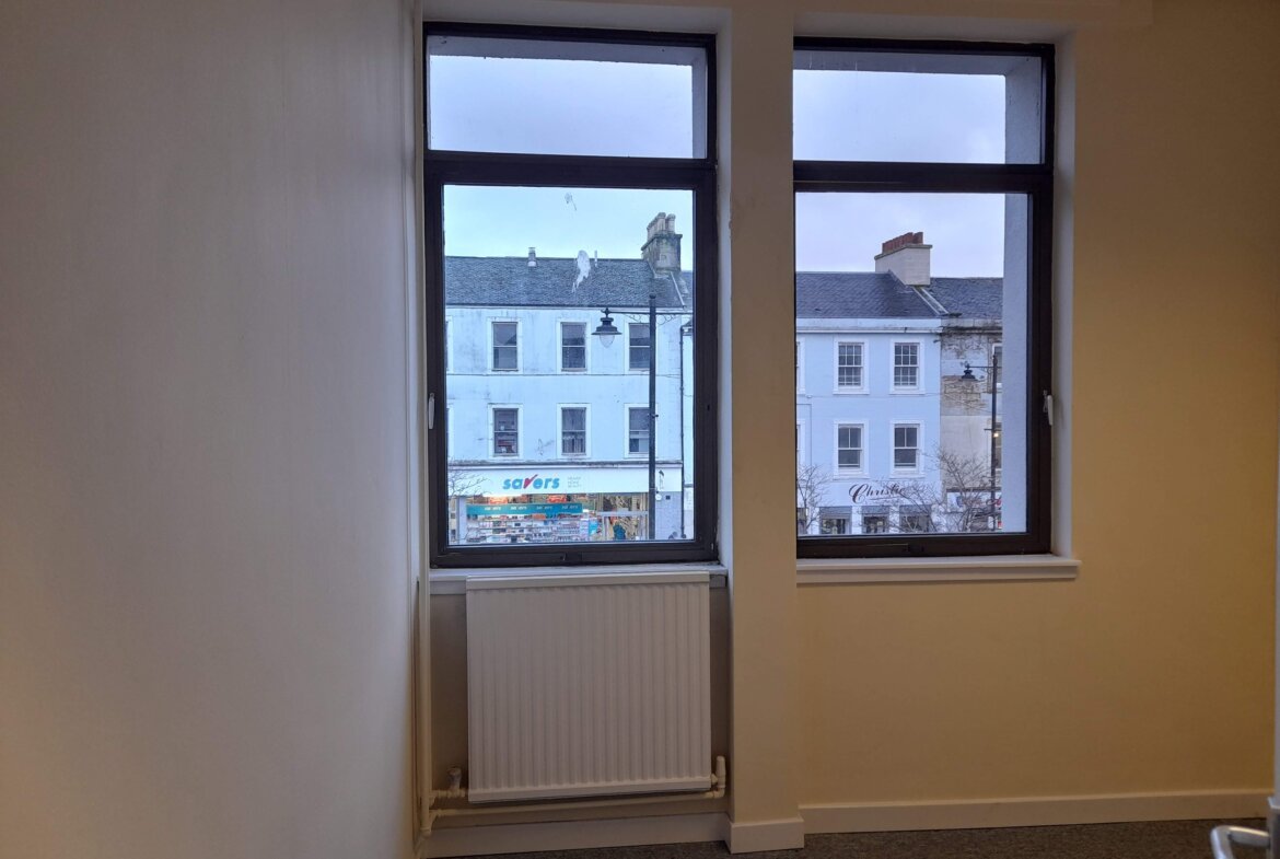 The property comprises the upper floor of a two storey building. The office suite is accessed via a stairwell from street level leading to a secure entry door at first floor level. Internally the premises comprise a mix of open plan as well as cellular office accommodation, with WC facilities and kitchen. The subjects benefit from perimeter trunking, suspended ceilings and gas central heating. The office has been recently refurbished including new carpet tiles. Neighbouring office occupiers include solicitors, accountants and banks.