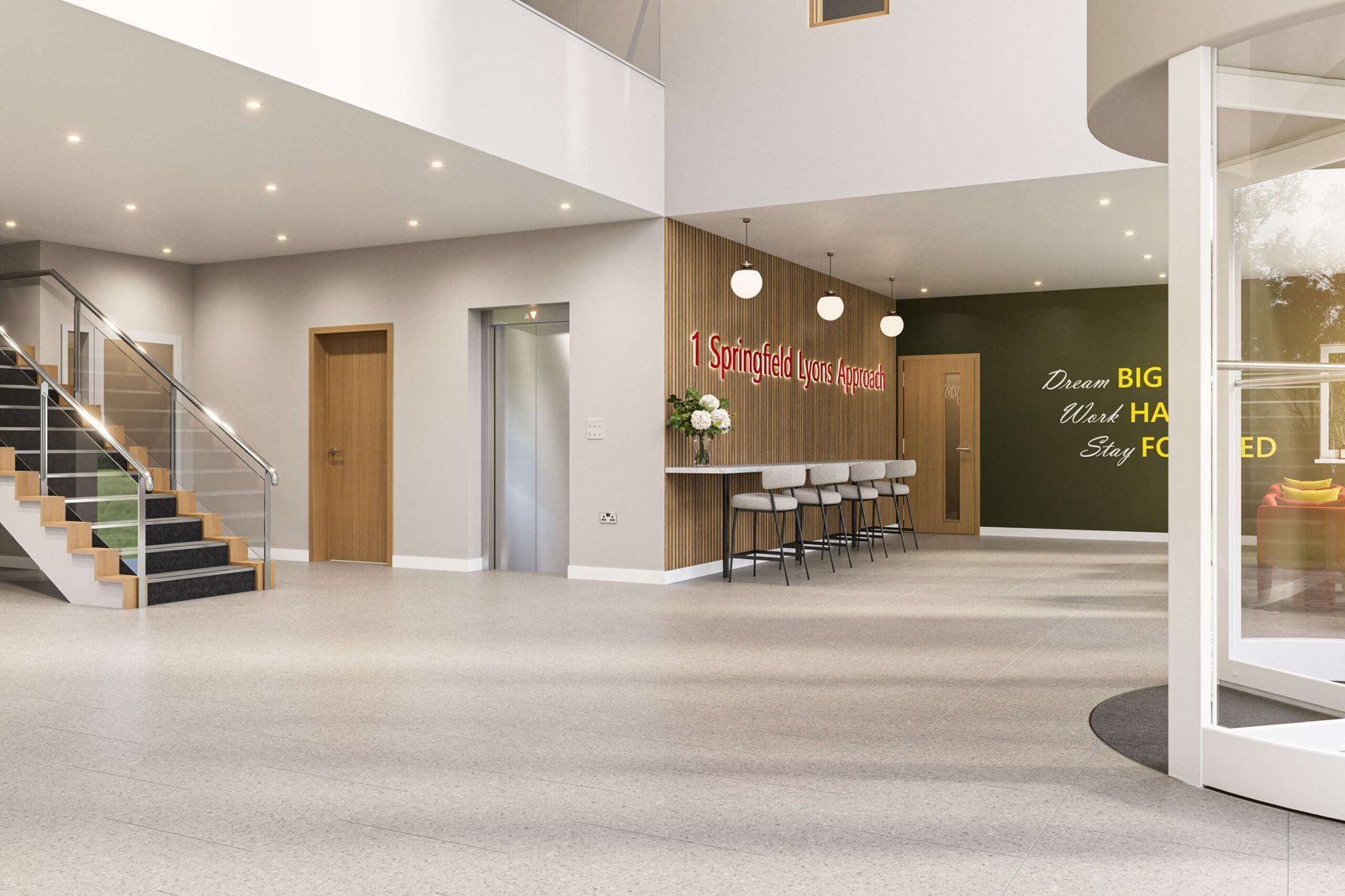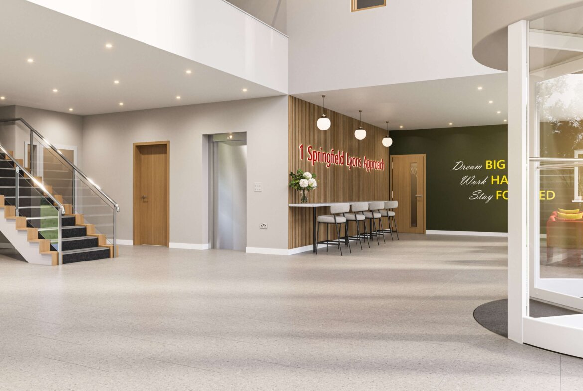 1 Springfield Lyons Approach is an HQ office building providing three floors of open plan office accommodation around a central core. The building is undergoing a comprehensive refurbishment programme to provide modern, high specification accommodation. The building will offer a variety of suite sizes, with the ground floor proposed to be split into three suites and the upper floors available as a whole or in part.