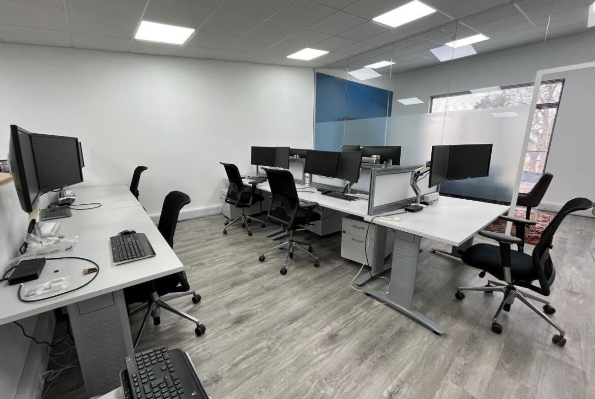 The specification includes LVT flooring, suspended ceilings with recessed LED lighting, perimeter trucking for power and network cabling and wall mounted heating / cooling units (not tested).