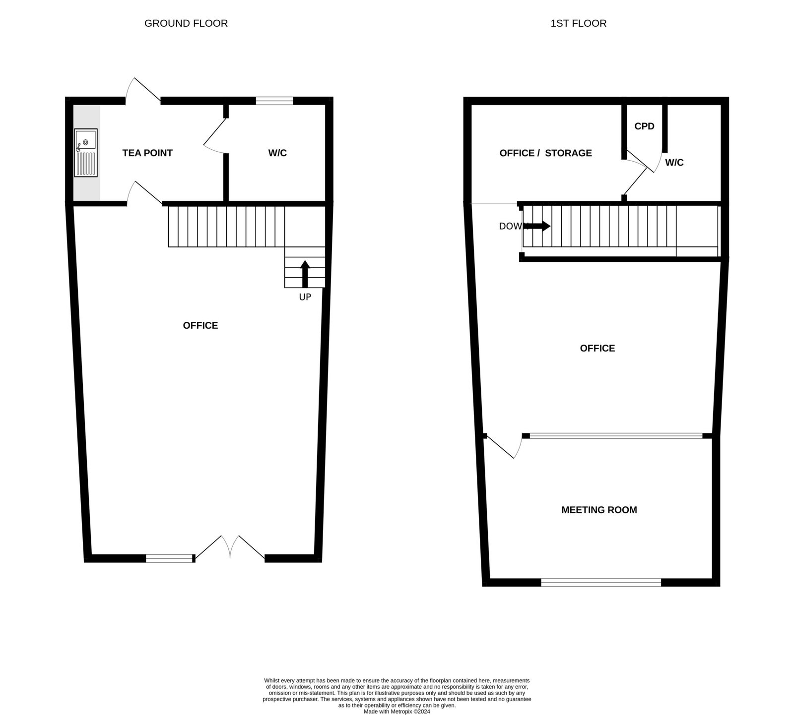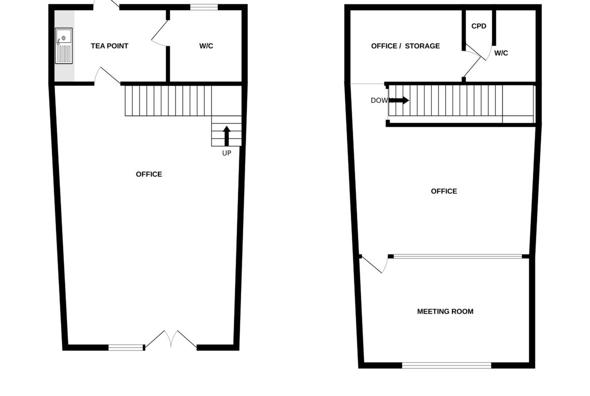 The office accommodation is self-contained and arranged over two floors. There is a large open plan office on the ground floor with a separate tea point and accessible WC to the rear. The first floor is predominantly open plan, with a glass partitioned meeting room, storage area and a single WC.
