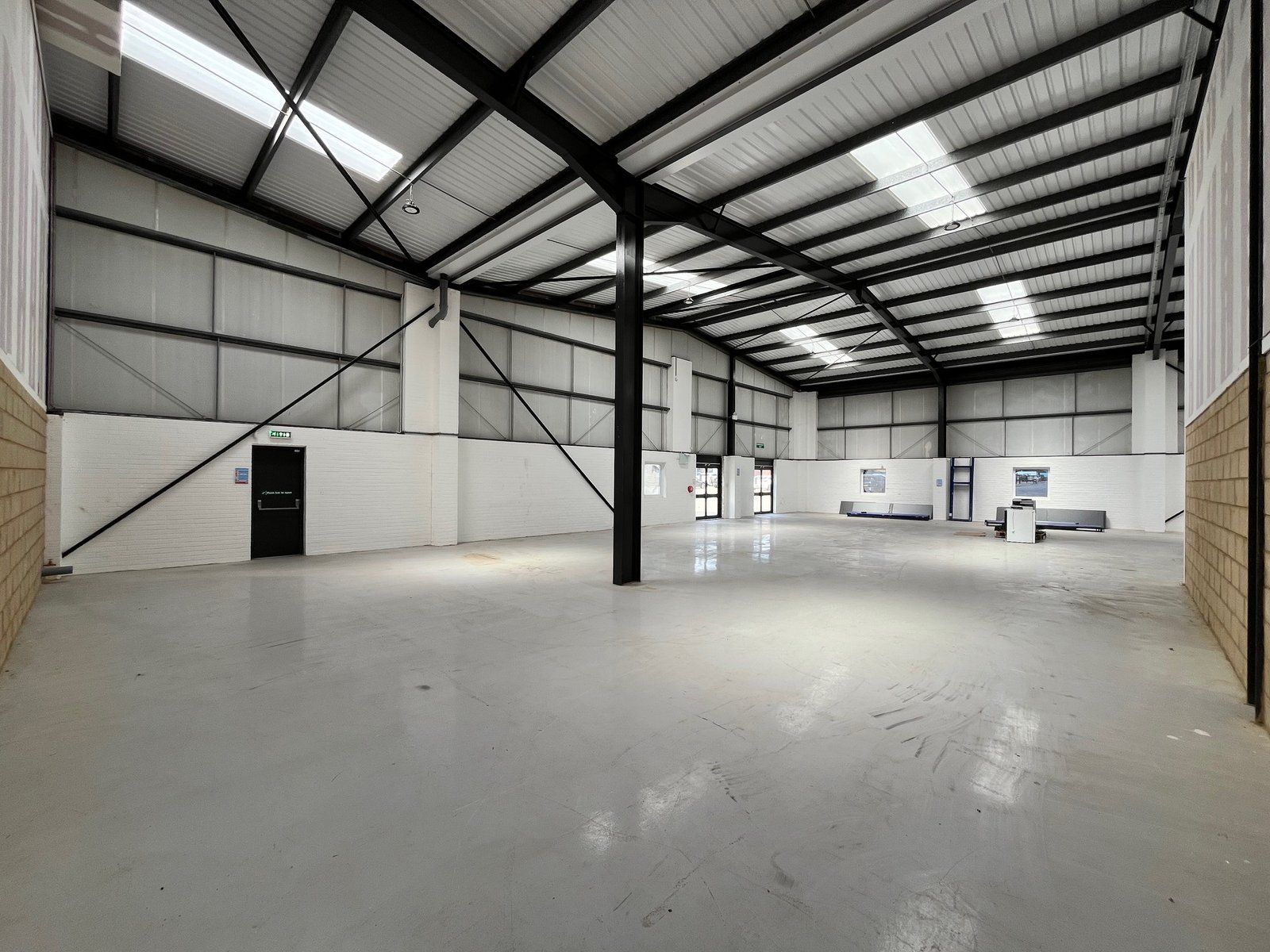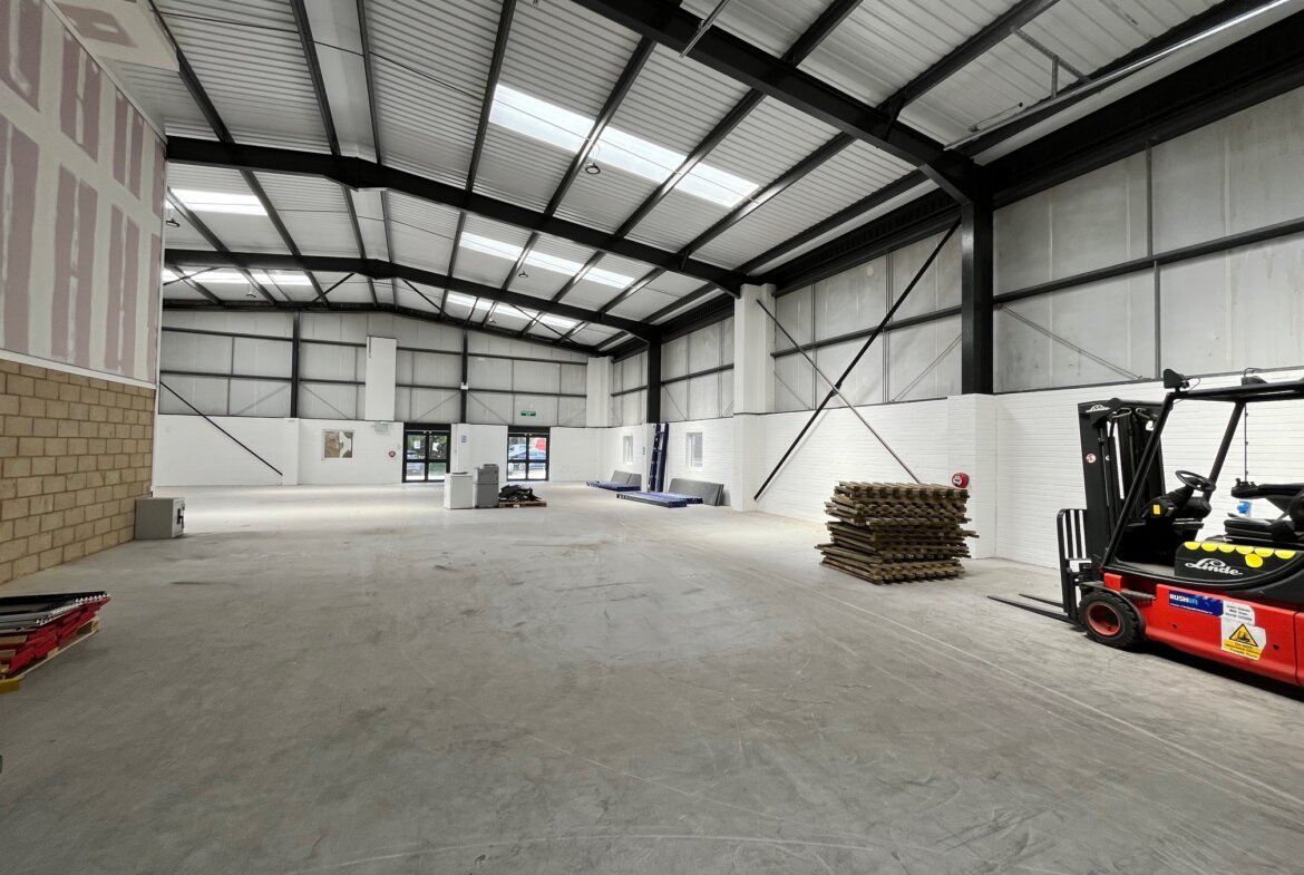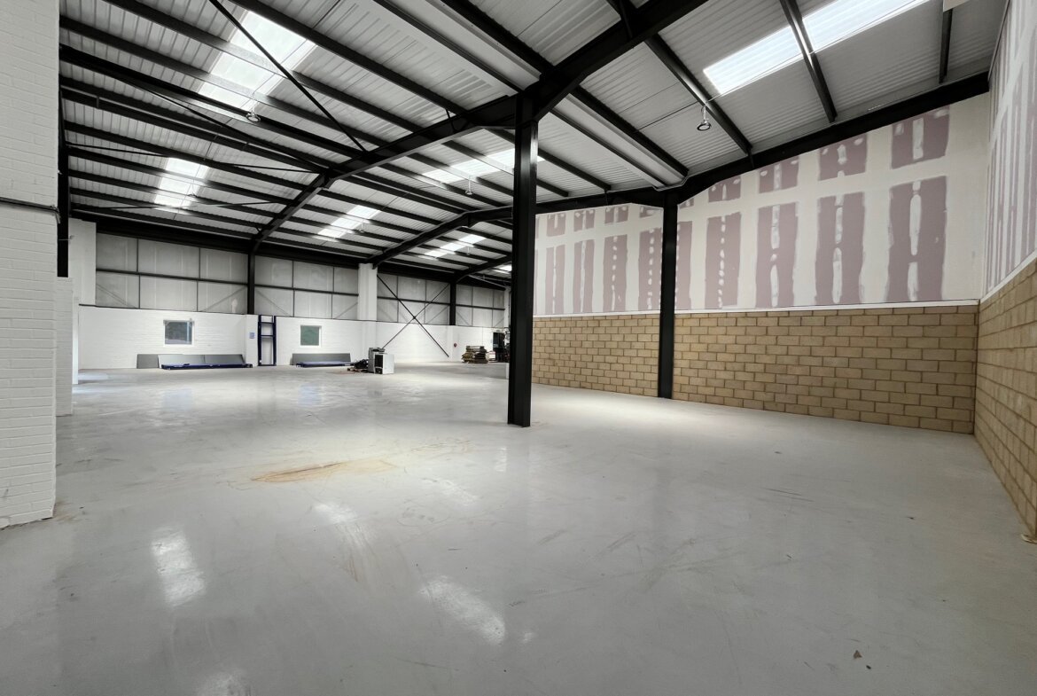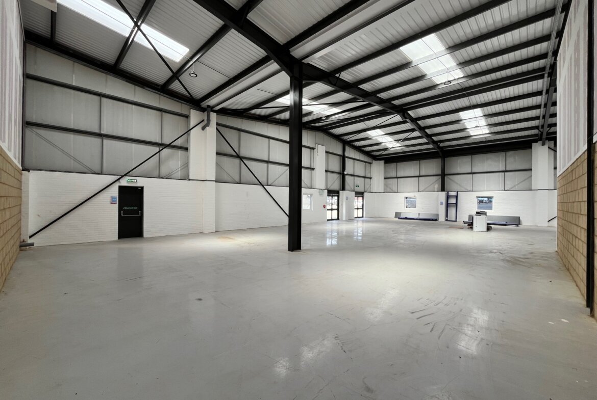 The property is built of a steel portal frame construction with brick and clad elevations beneath a pitched and insulated roof. The unit comprises an L-shaped, open-plan warehouse space with two large electrically operated loading doors at the rear and a glazed personal entrance at the front. Specification includes LED lighting, an intruder alarm and three phase power (not tested). Eaves height approx. 5.4m and apex 6.4m.