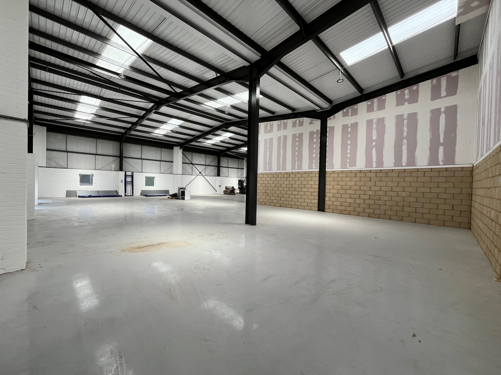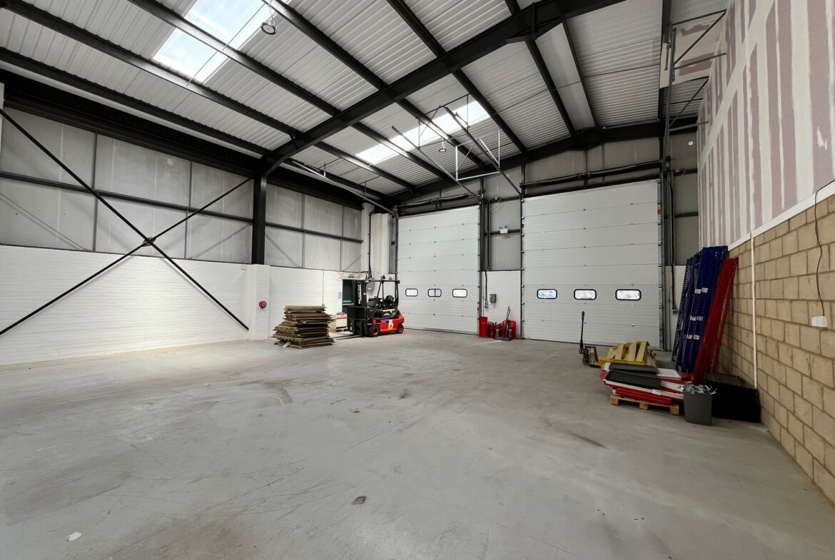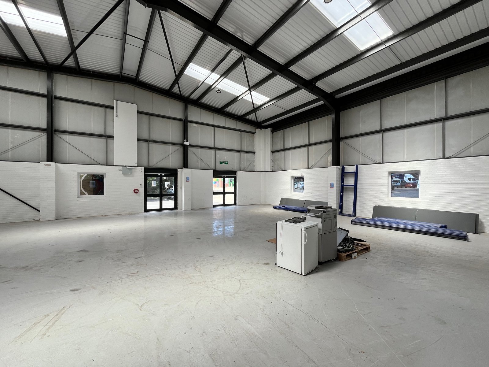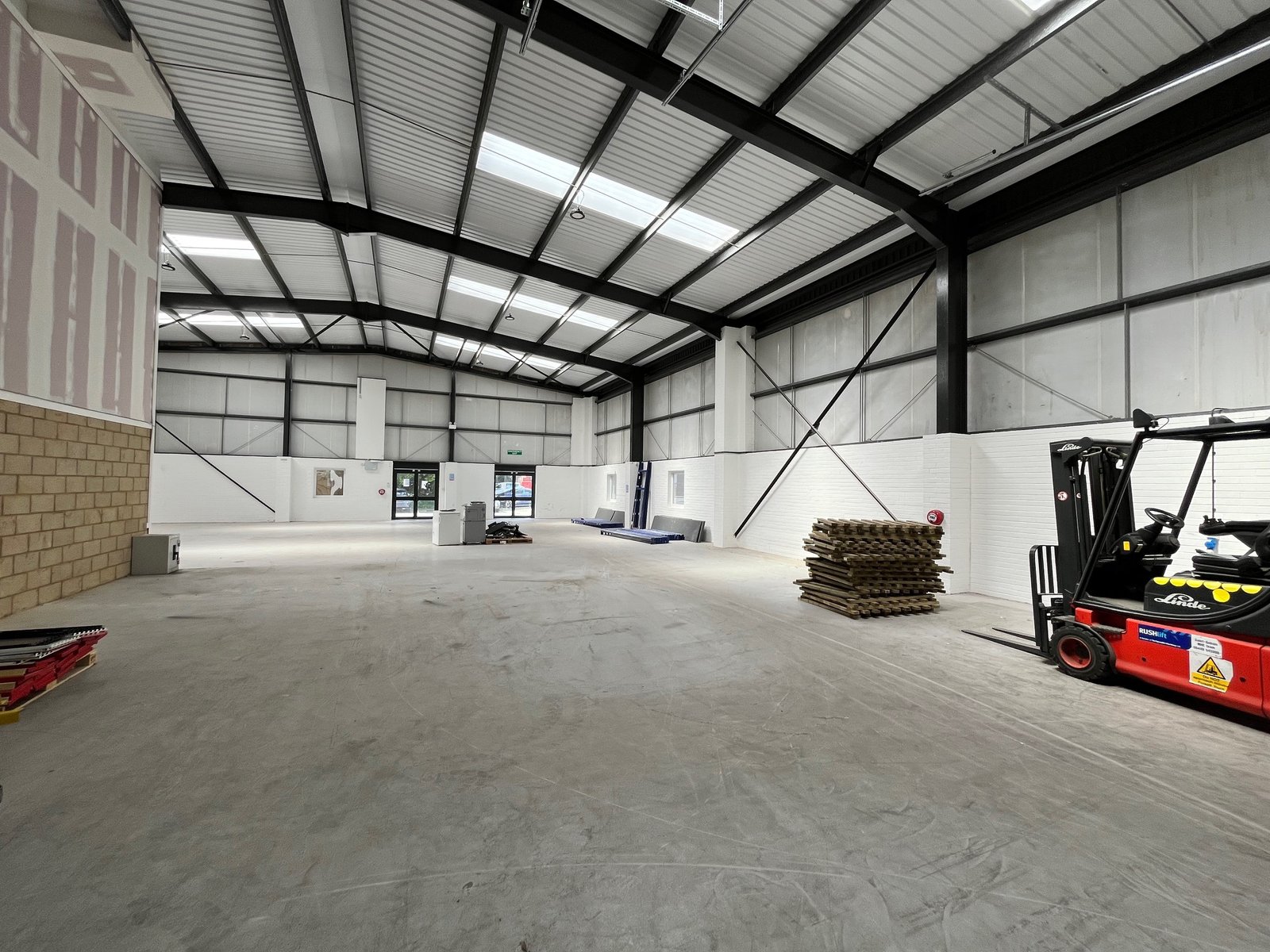 The property is built of a steel portal frame construction with brick and clad elevations beneath a pitched and insulated roof. The unit comprises an L-shaped, open-plan warehouse space with two large electrically operated loading doors at the rear and a glazed personal entrance at the front. Specification includes LED lighting, an intruder alarm and three phase power (not tested). Eaves height approx. 5.4m and apex 6.4m.