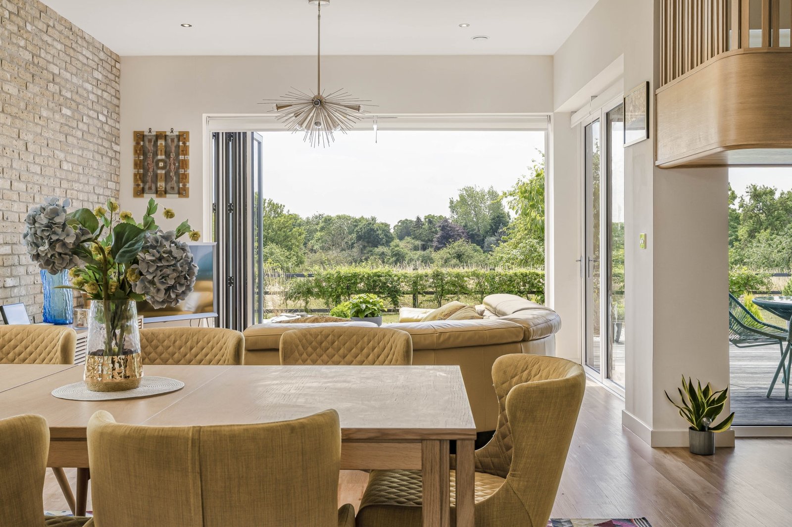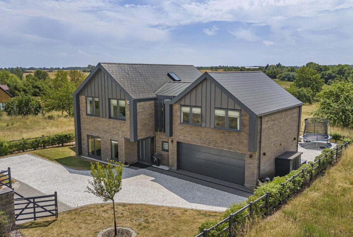 Stunning architect-designed five-bedroom detached home in Caxton, featuring an open-plan kitchen/day room, air source heat pump, underfloor heating, and landscaped south-facing garden with countryside views.