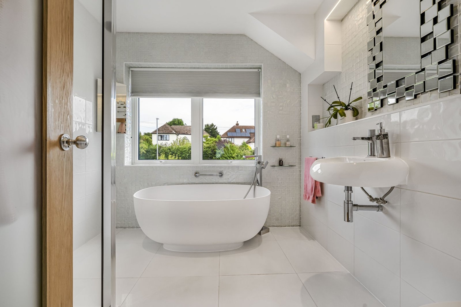 With window to the front aspect, contemporary Rak suite comprising low level wc with hidden cistern and eco flush plate, wall mounted was basin with chrome tap over, freestanding bath with freestanding chrome mixed tap over with separate handheld shower head attachment and glass and chrome shower cubicle with sliding door and drencher head over, tiled walls, tiled floor, chrome heated towel rail, electric underfloor heating.