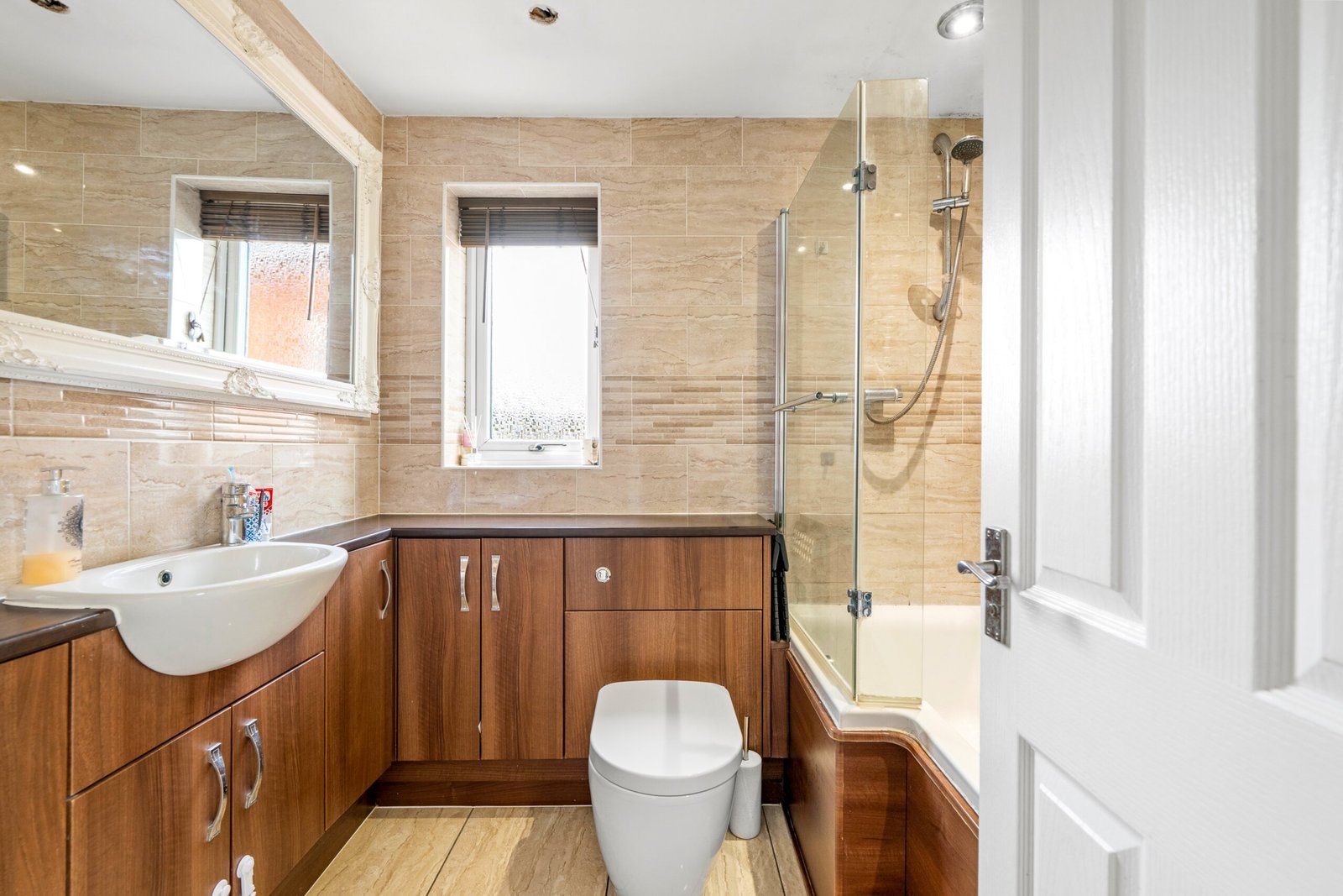 Double glazed window to side, bath with wall mounted shower unit over and glazed shower screen, vanity wash basin and WC unit, tiled flooring and walls.