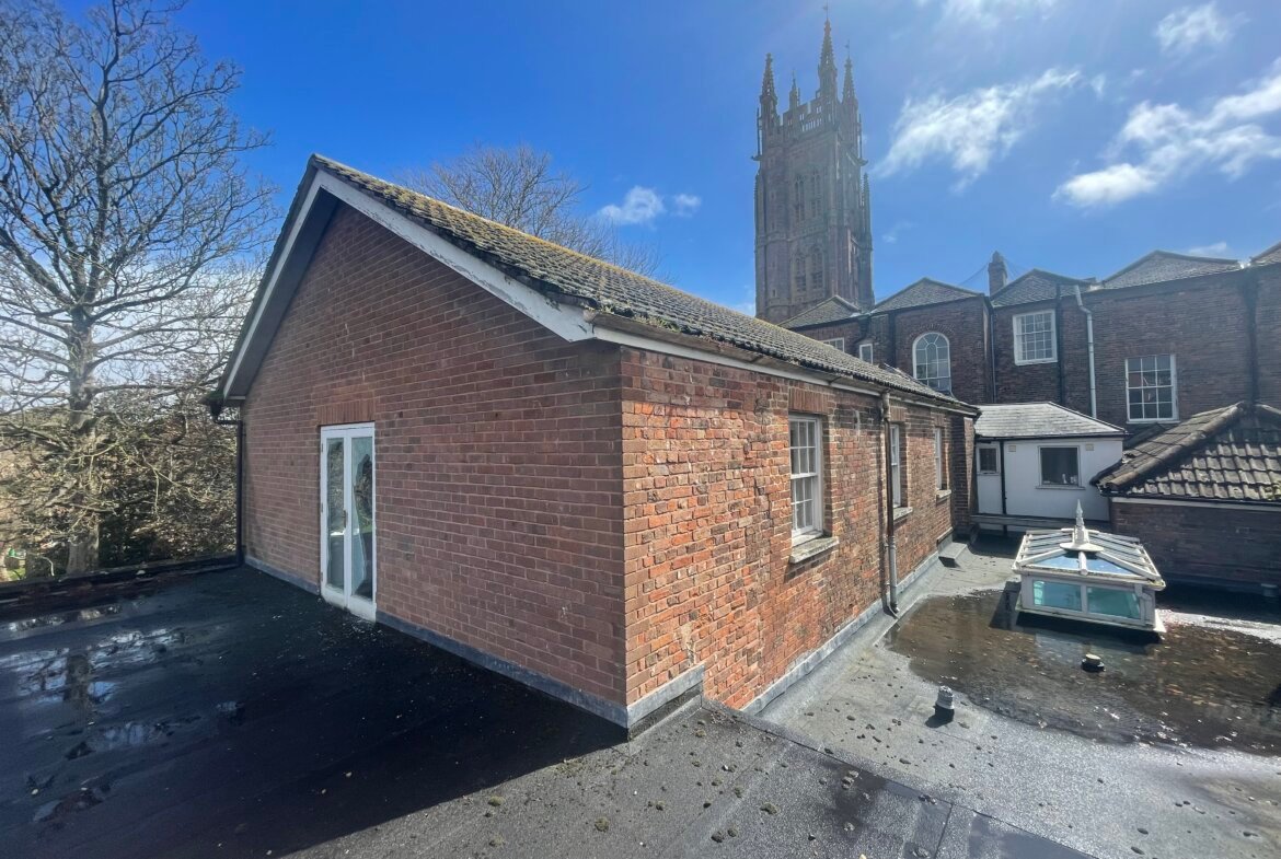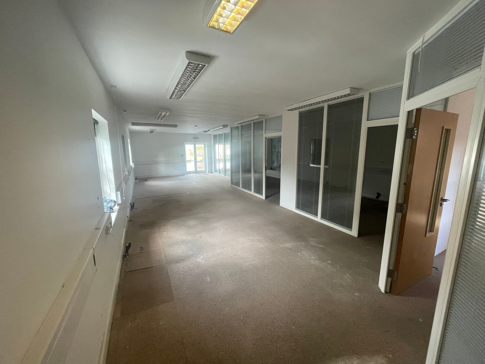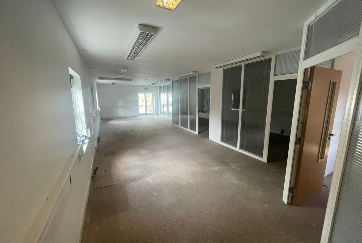 Further offices currently inaccessible/accessed by the flat roof 13.88m x 7.11m with glass partitioning to make three cellular offices with the remainder being open plan office accommodation. Windows to both sides.