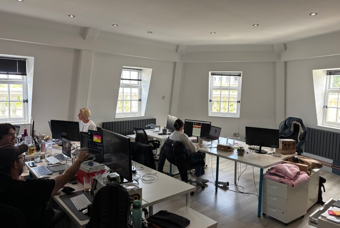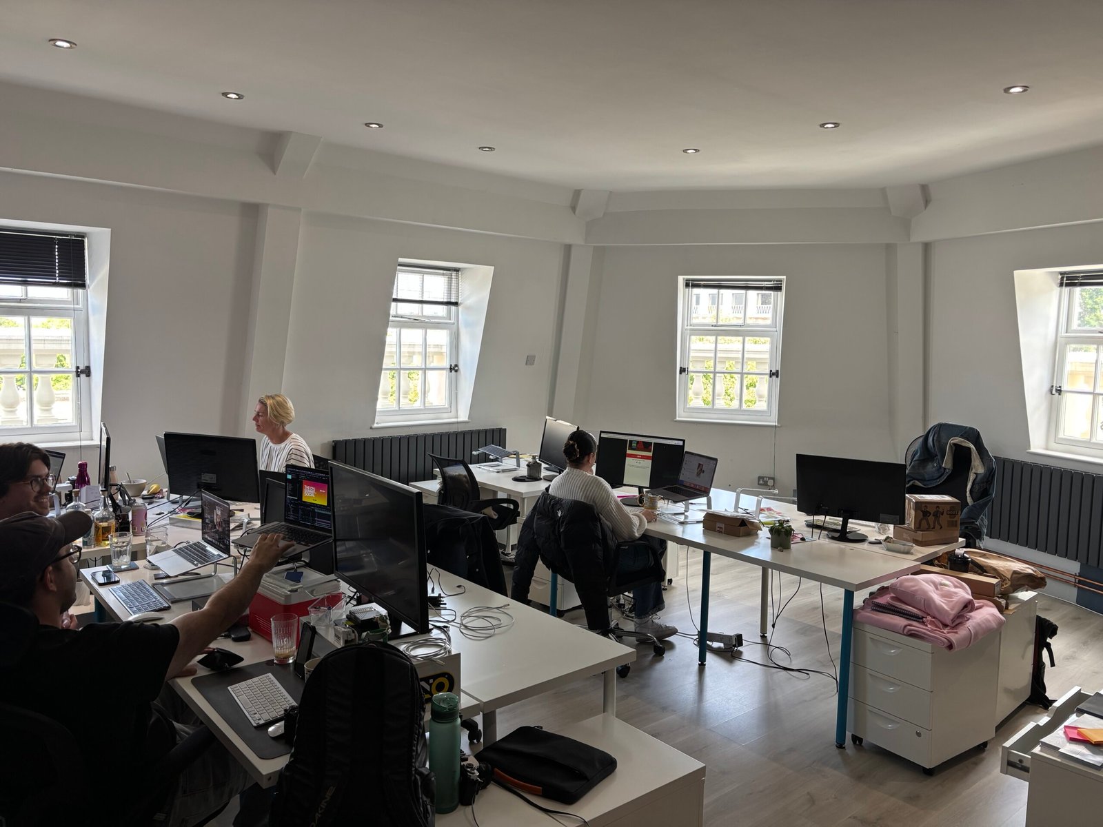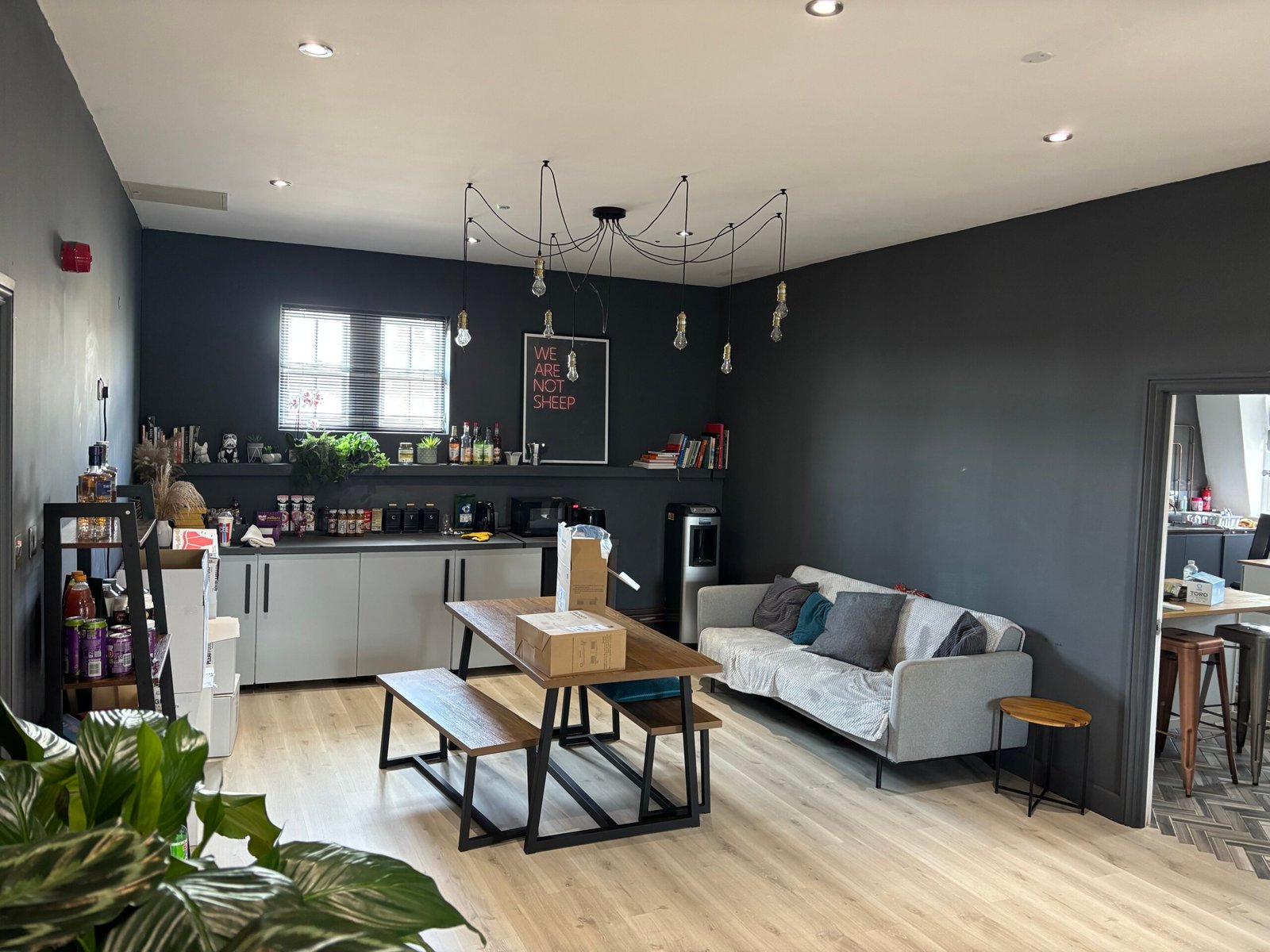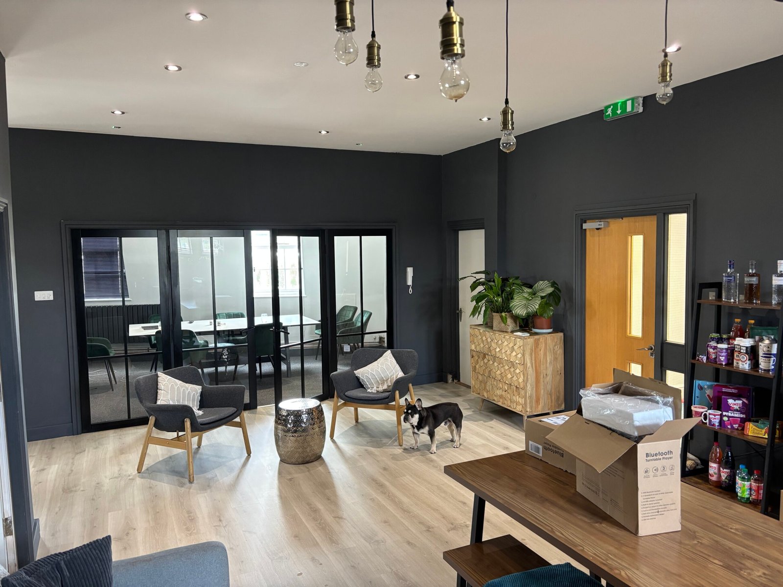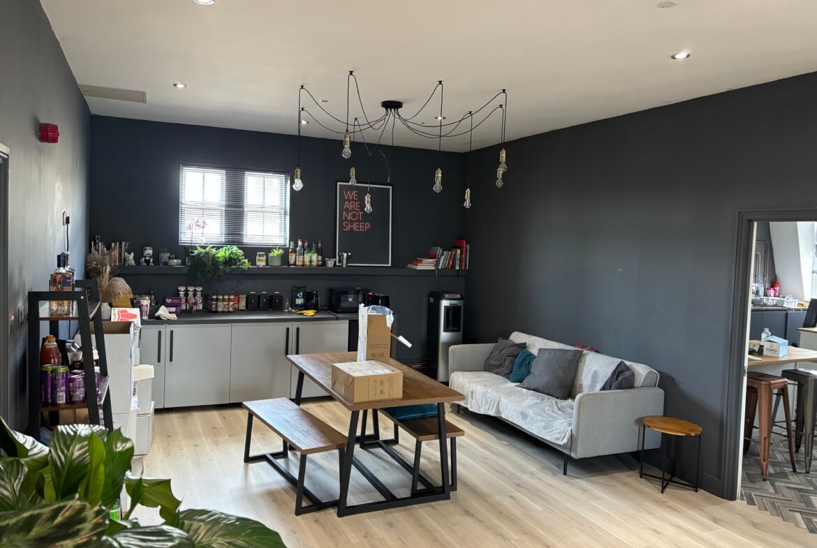 The third floor offers a bold, stylishly refurbished space inspired by a New York penthouse studio. This distinctive suite features a large open-plan area, glazed boardroom, spacious kitchen, breakout zone, and a storage room. Modern finishes include laminate flooring throughout, statement dark colour palettes, industrial-style LED pendant lighting, black-framed glazed partitions, contemporary radiators, and a secure door entry system-making this an ideal choice for creative or design-led businesses.