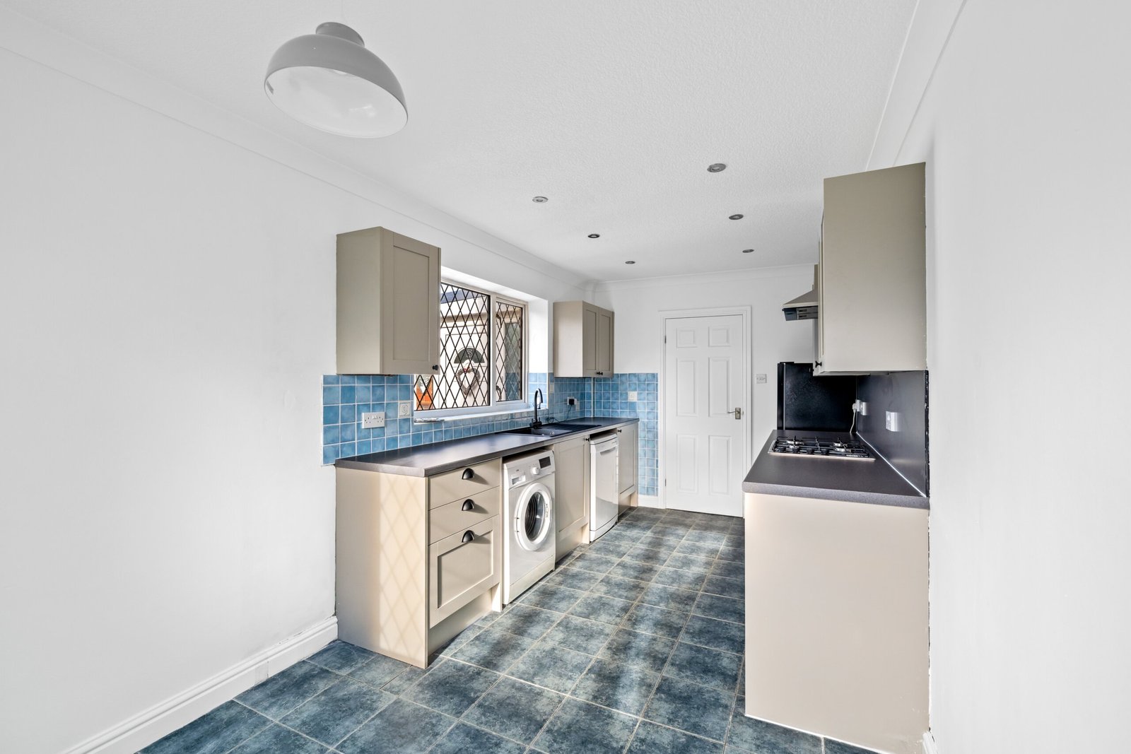 Double glazed windows to front and side, drainer sink inset to worktop, base and eye level storage units, integrated gas hob with extractor above and oven below, spaces for washing machine, dishwasher and fridge freezer, tiled splash backs, tiled flooring, radiator.