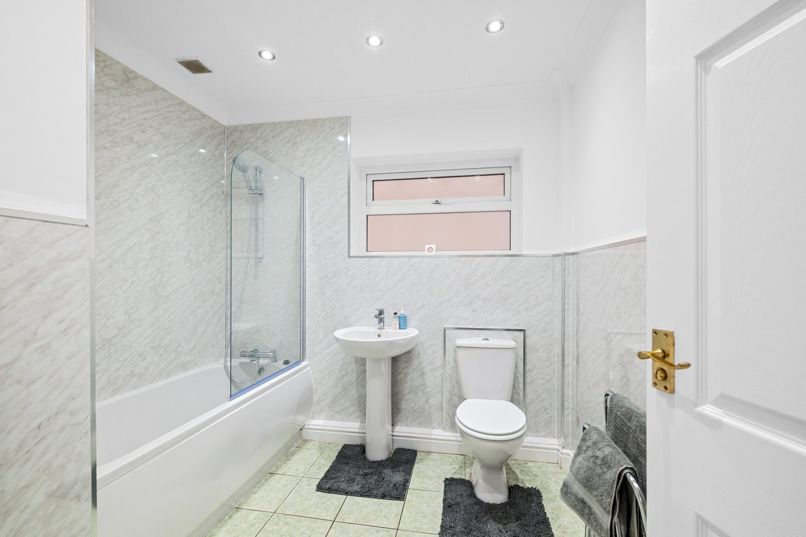 Double glazed window to side, WC, pedestal wash basin, bath with wall mounted shower unit over and glazed shower screen, radiator.