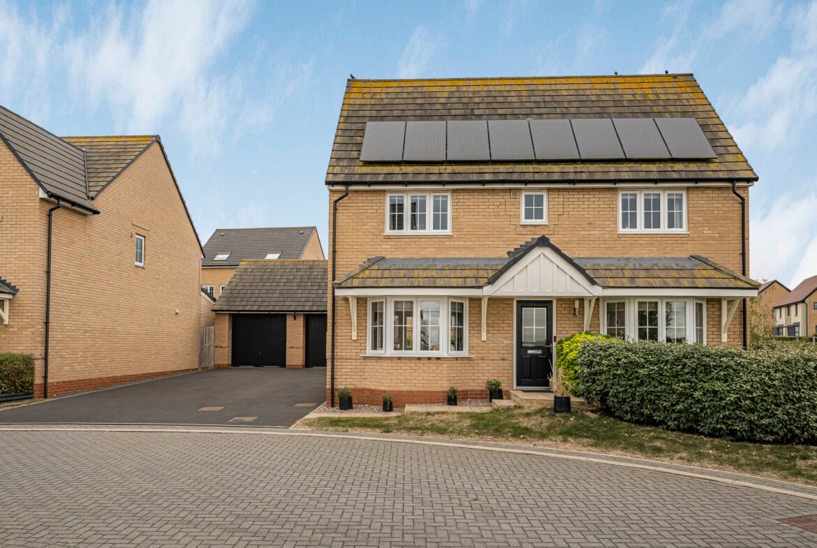 An impressive four-bedroom double-fronted home with detached double garage, set in a sought-after development just three miles from Huntingdon station.