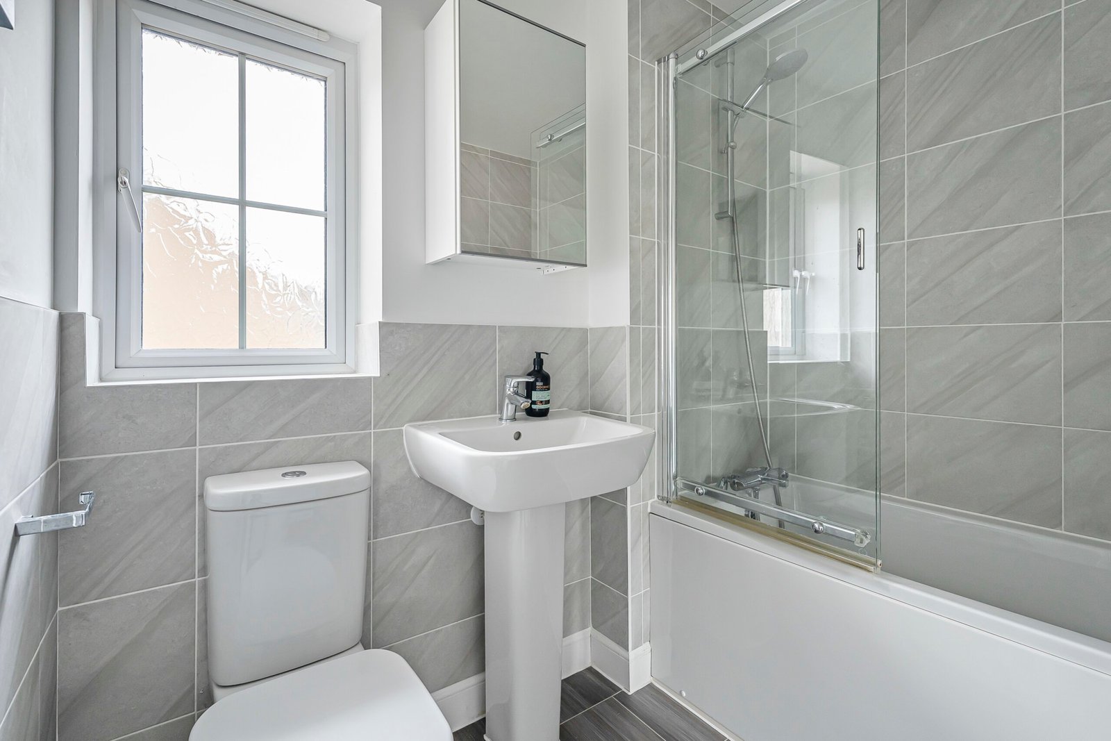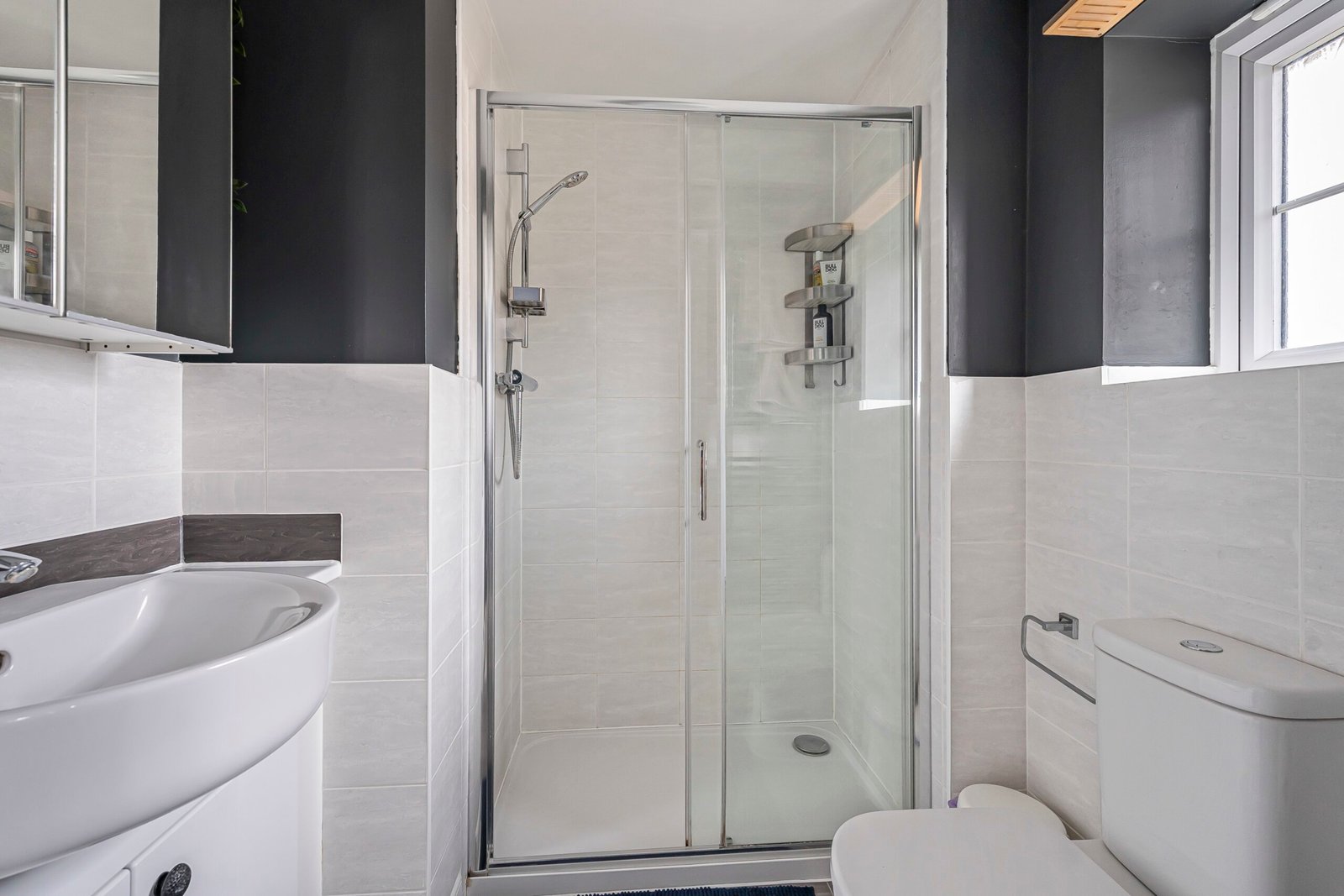 With window to the front aspect, suite comprising; low level wc with eco flush button, vanity unit with inset wash basin with chrome mixer tap over and shower enclosure with glass and chrome sliding door, part tiled walls, chrome heated towel rail.