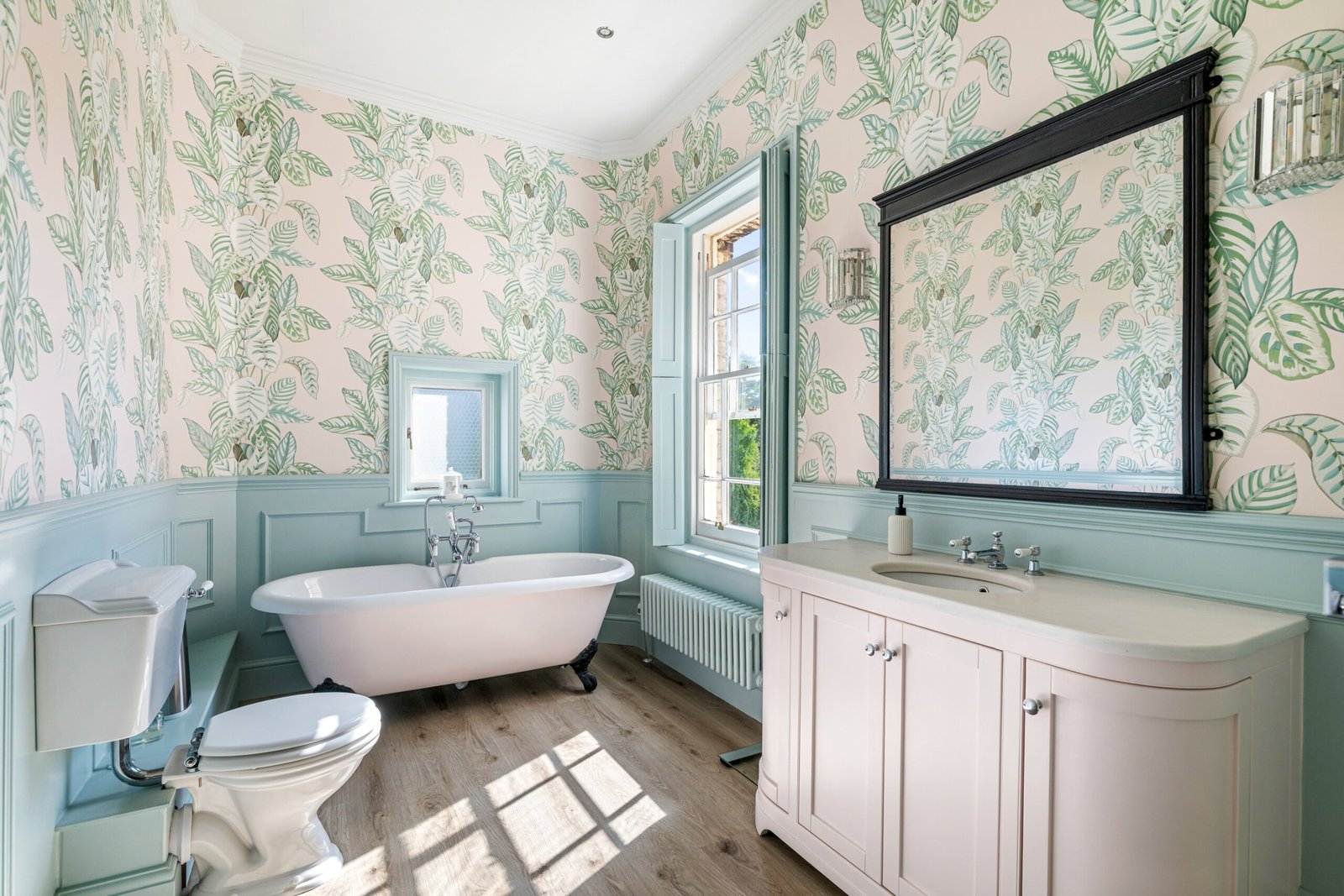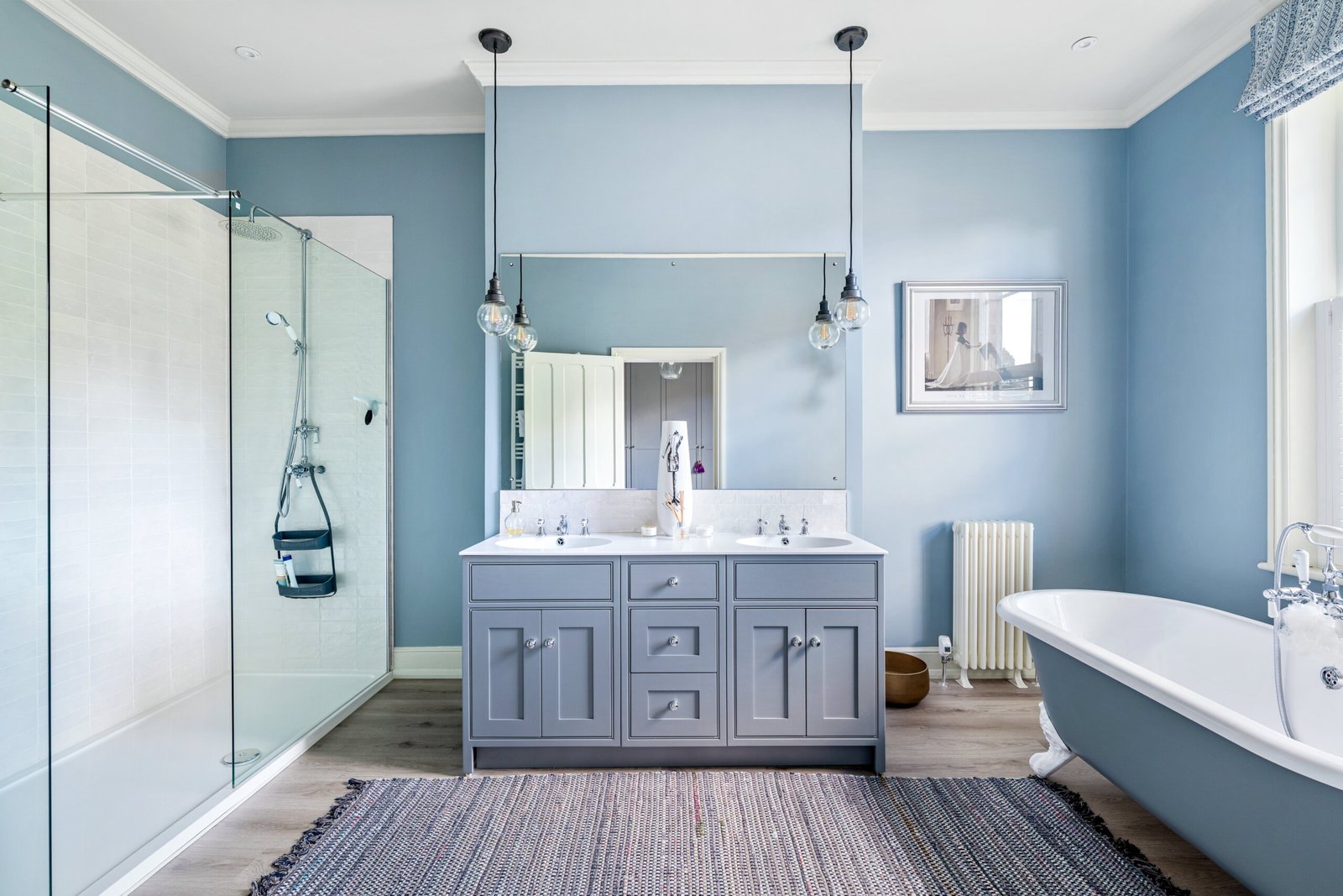 Sash window with shutters to rear elevation, his and hers countertop wash basins with storage below, free standing roll top bathtub, large walk-in shower enclosure, WC, heated towel rail, two radiators.