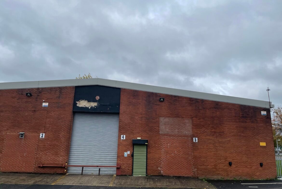 The property comprises an end of terrace steel portal frame warehouse with brickwork elevations under a pitched roof.