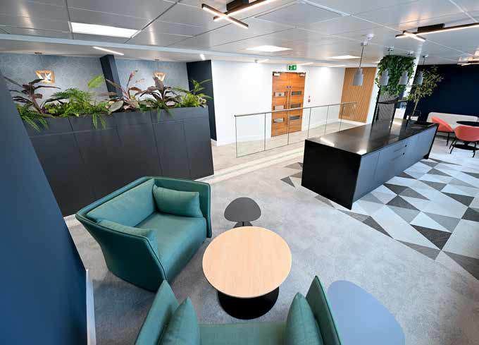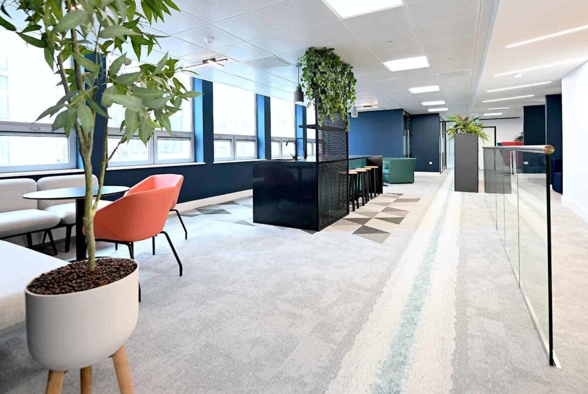 The building features a contemporary remodelled reception, ground floor coffee shop, communal breakout area, bookable meeting rooms, and health club quality changing facilities.