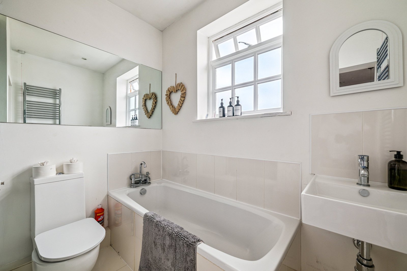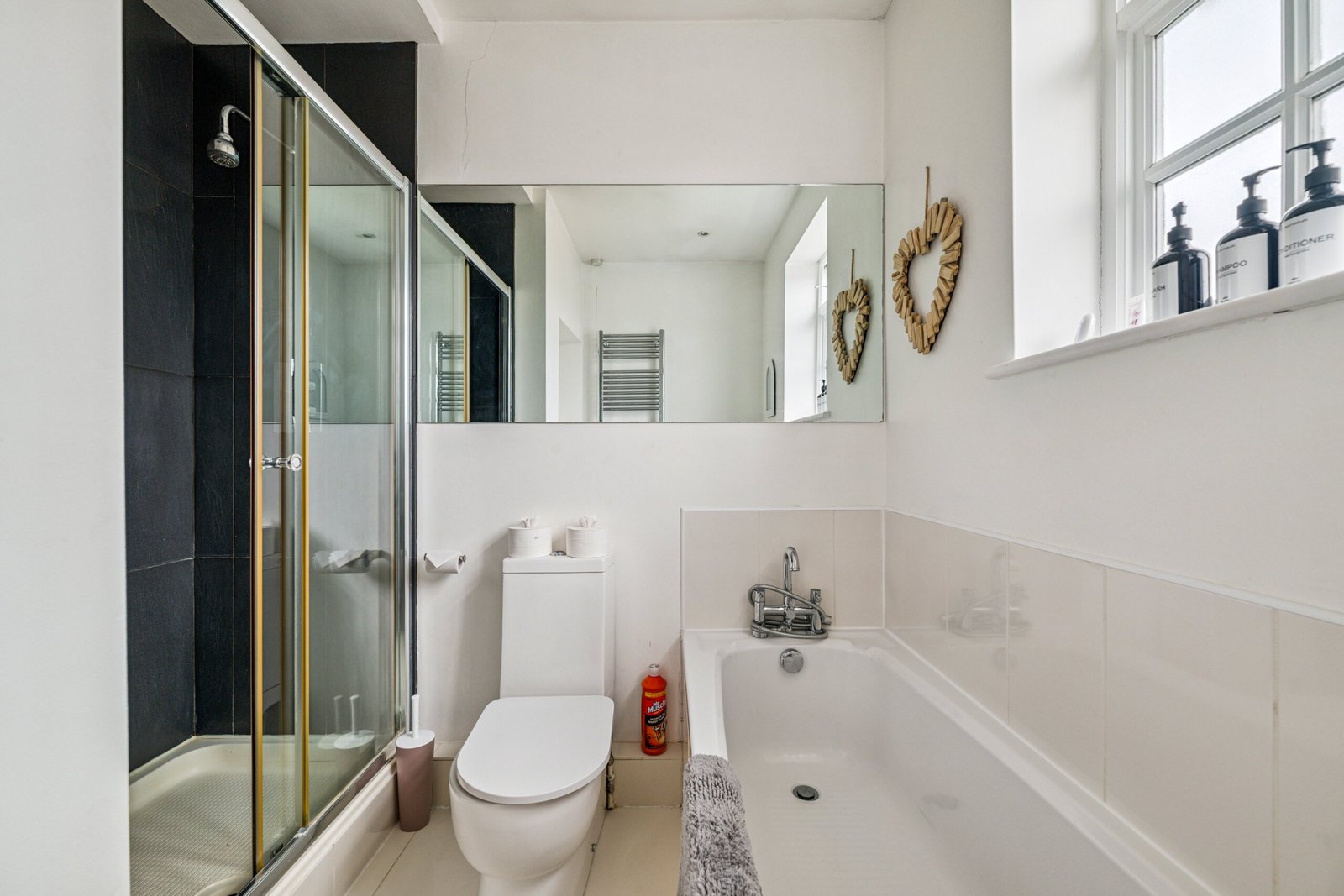 Double glazed casement window to elevation, four piece suite comprising panelled bath, wash hand basin, low flush WC, shower cubicle, heated towel rail, part tiled walls, extractor.