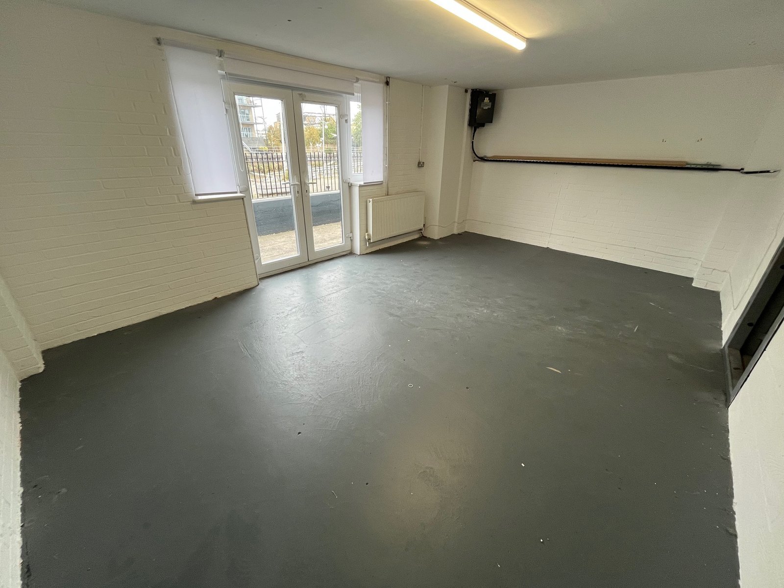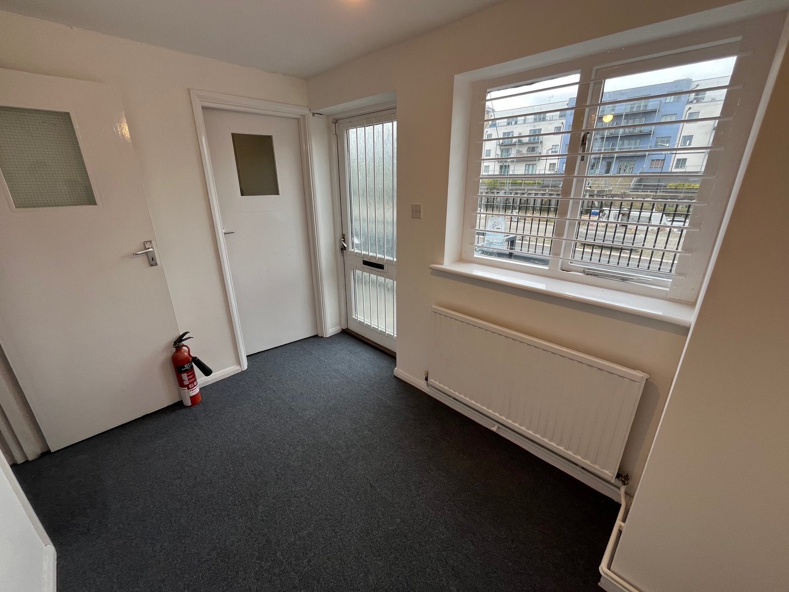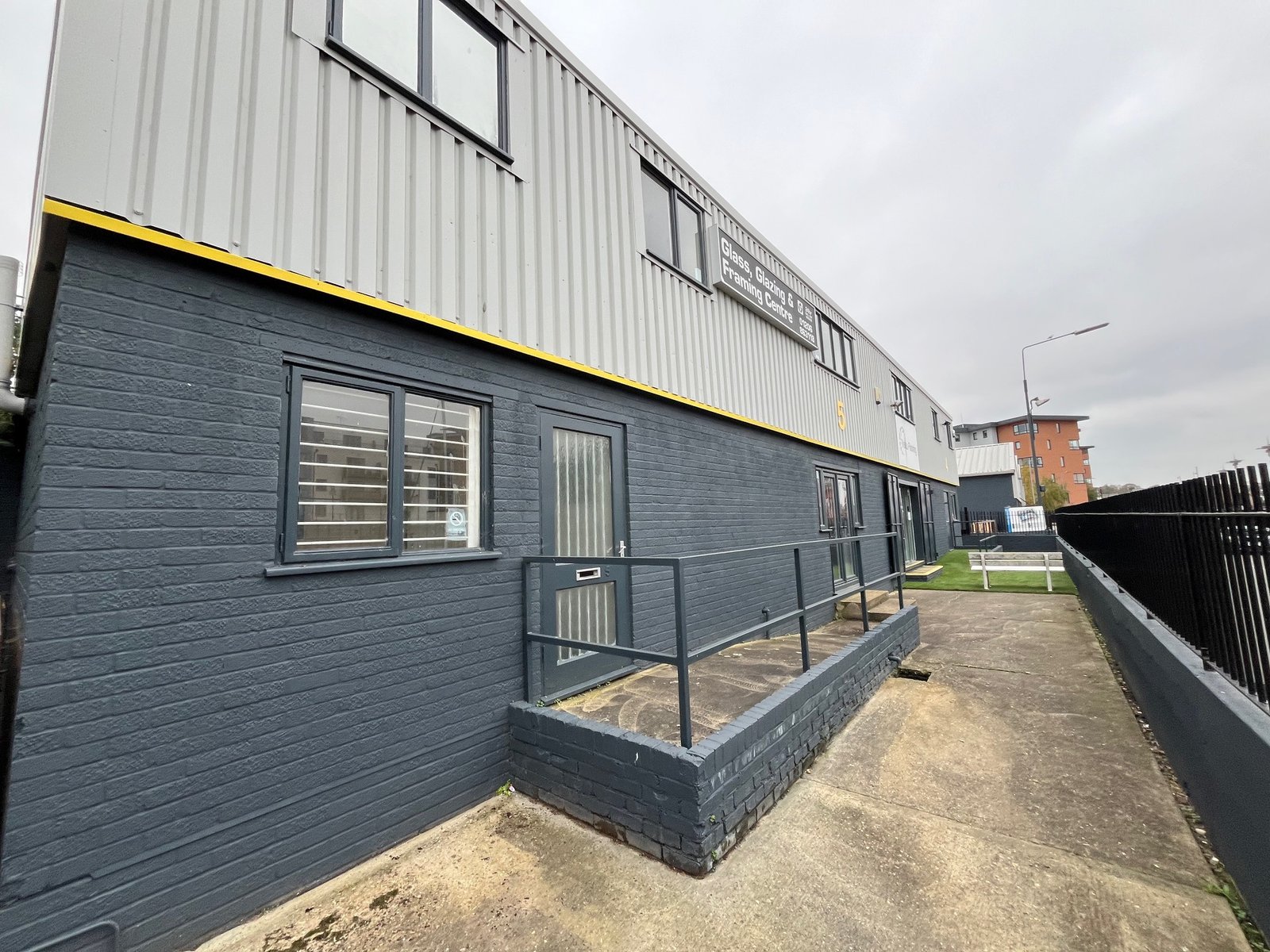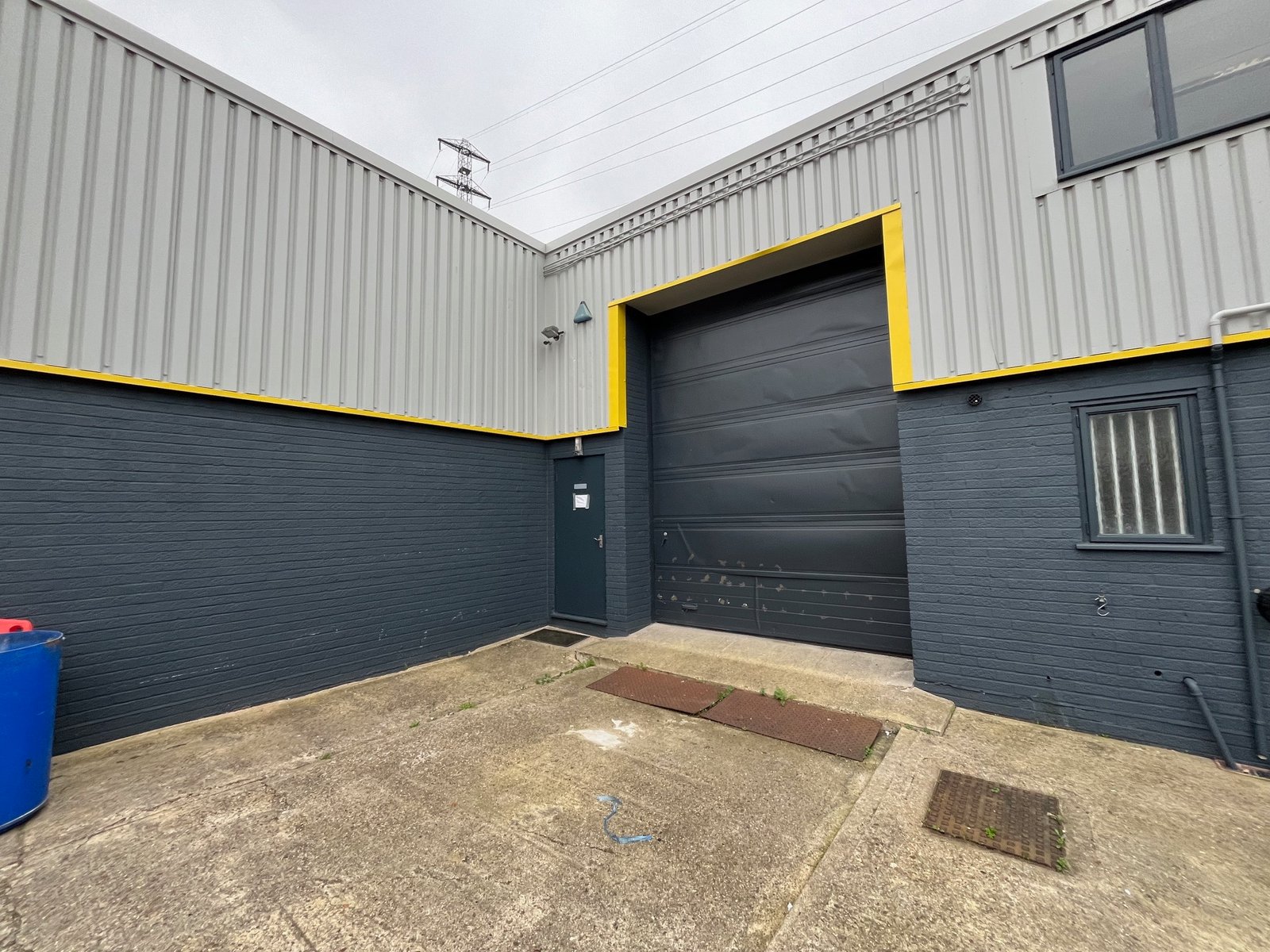 There are two additional entrances on the front elevation (double fully glazed personnel doors , and single personnel door), plus an additional personnel door next to the shutter for access / exit.