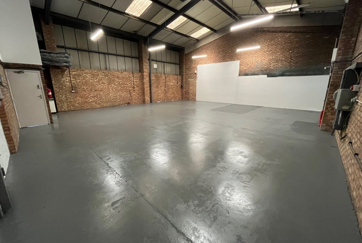 The unit is of steel portal frame construction, with part brick and part profile steel cladding under a pitched roof incorporating translucent roof lights. The warehouse has a minimum eaves height of approx. 4.7m (apex of approx. 5.8m).