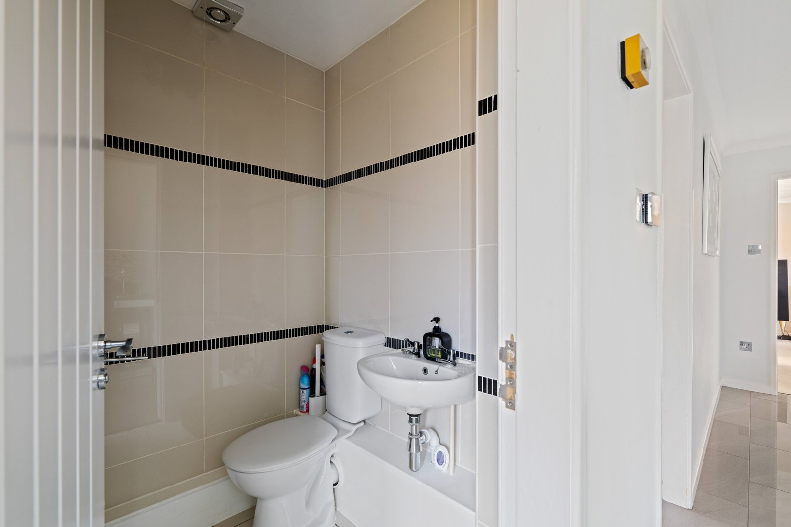Two piece suite comprising low flush WC, wash hand basin, heated towel rail, fully tiled walls.