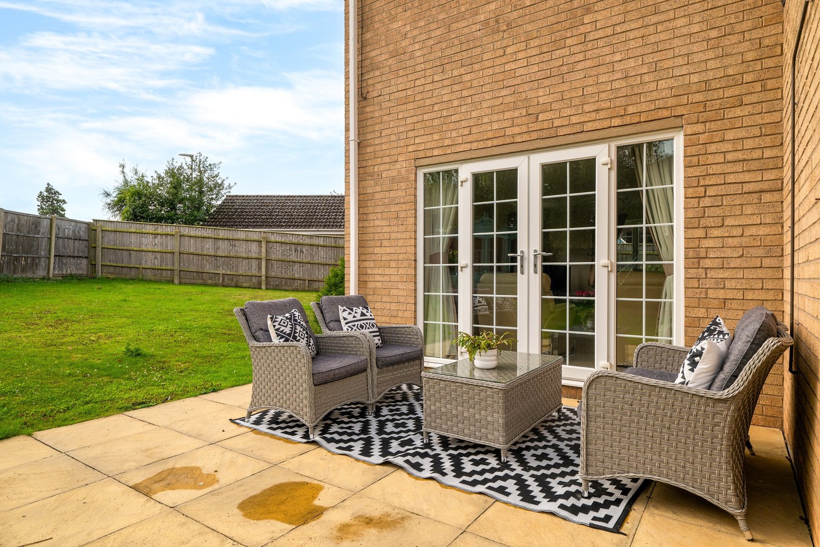 The property sits in a generous corner plot extending to around 0.18 of an acre. The grounds are mainly laid to lawn with a large wrap around patio, low maintenance borders, tarmac and gravel driveway and a double garage with electric roller shutter door, power and light. There is also a summer house and a timber garden shed.