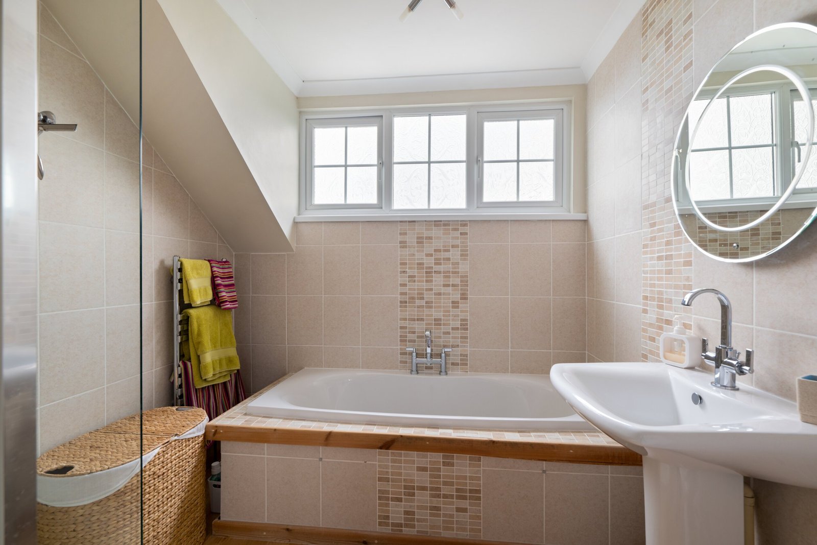 Double glazed casement window to rear elevation, four piece suite comprising tiled bath, pedestal wash basin, low flush WC, shower cubicle, extractor, part tiled walls.