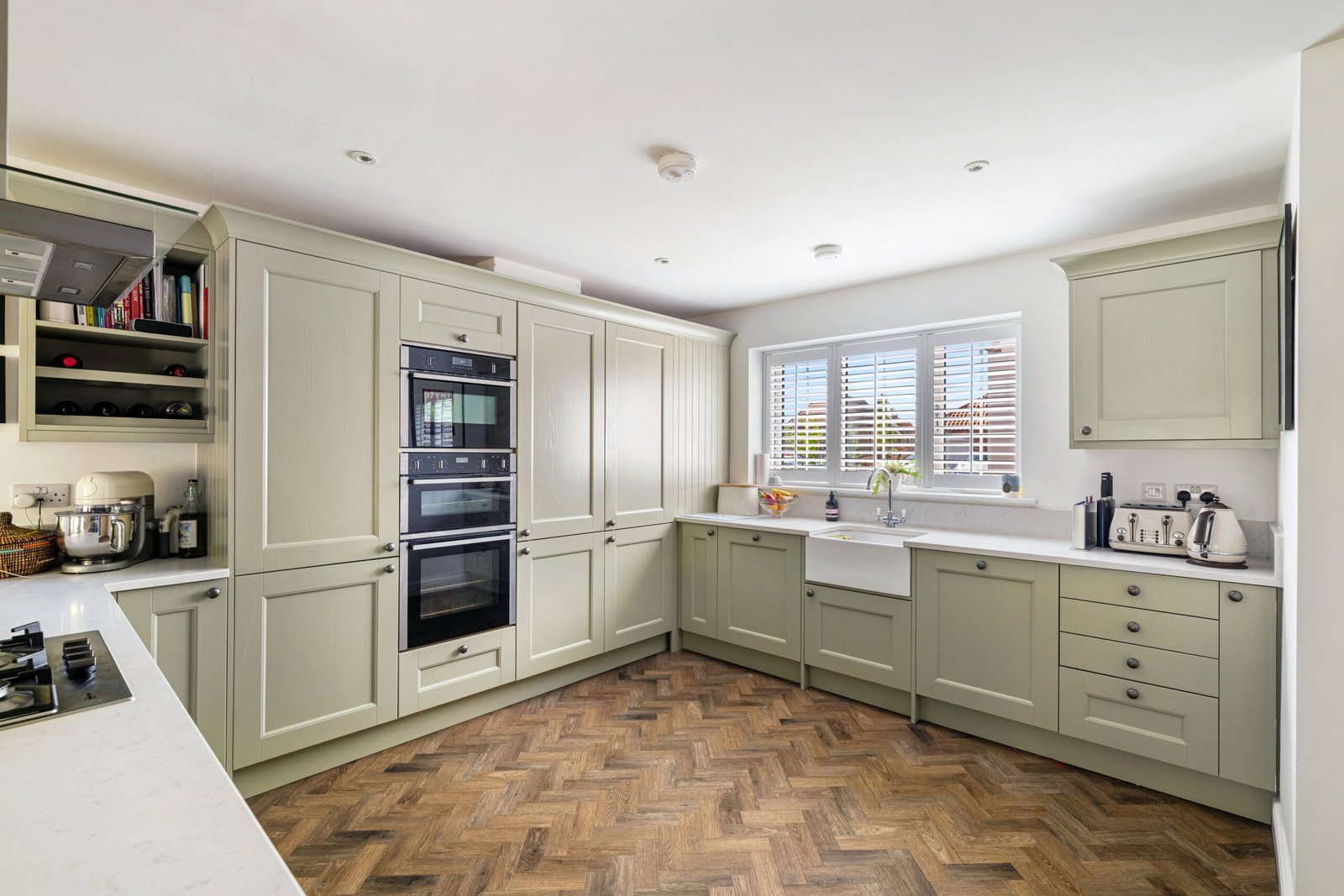 Double glazed windows to front and side, Bi-folding doors opening onto patio, further side entrance door, high quality fitted kitchen with Belfast sink, worktops, matching base and eye level storage units, integrated double oven, fridge, freezer, wine cooler, dishwasher and gas hob with extractor above.