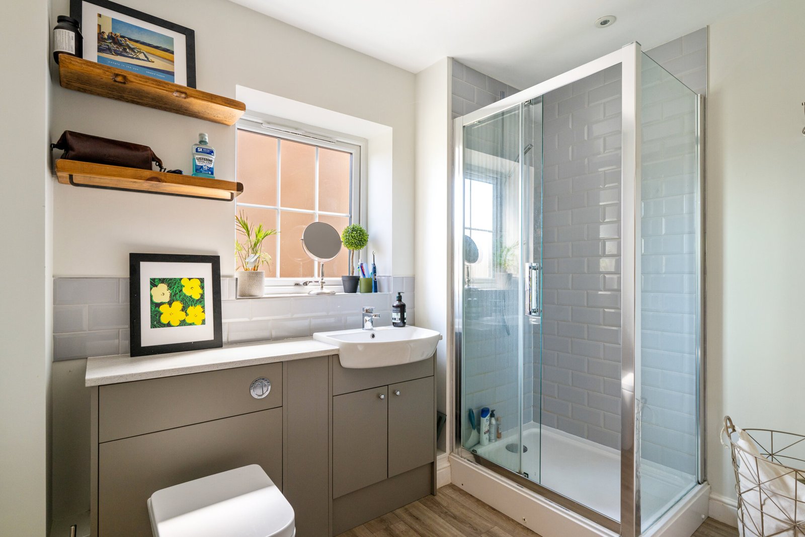 Double glazed window to side, shower cubicle, vanity wash basin and WC with concealed cistern, tiled splash backs, heated towel rail.