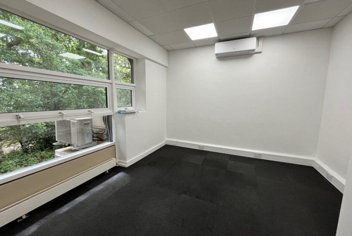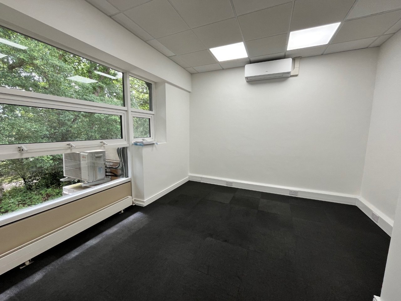 The office comprises a two-storey mid-terraced building with large double-glazed windows offering views over a spacious landscaped courtyard at the front and a tree-lined lane to the rear.
