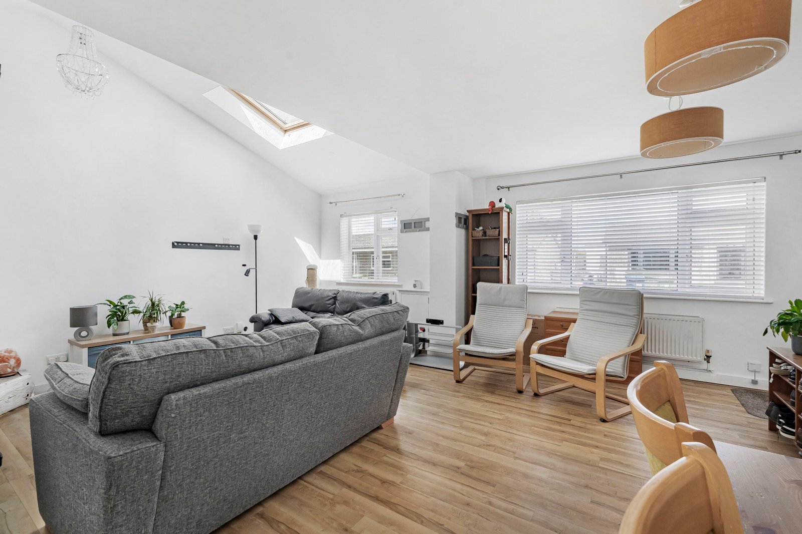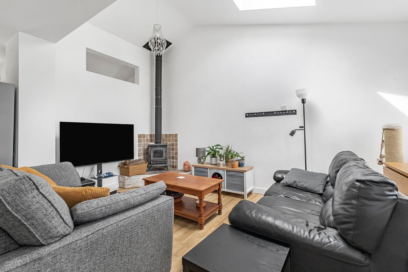 Window to the front aspect, Vaulted ceiling with Velux window, raised wood burning stove with tiled hearth and surround, wood effect flooring
