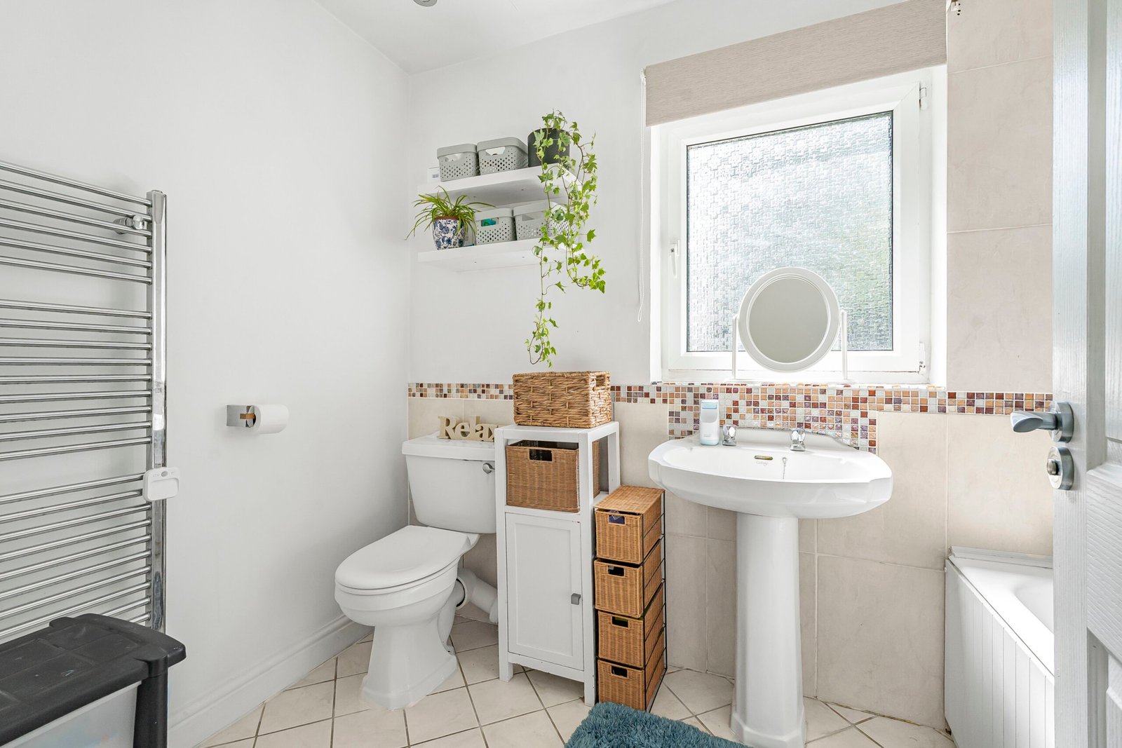 With window to the rear aspect, suite comprising; low level wc, pedestal wash basin and panelled bath with shower over, chrome heated towel rail, tiled floor, part tiled walls
