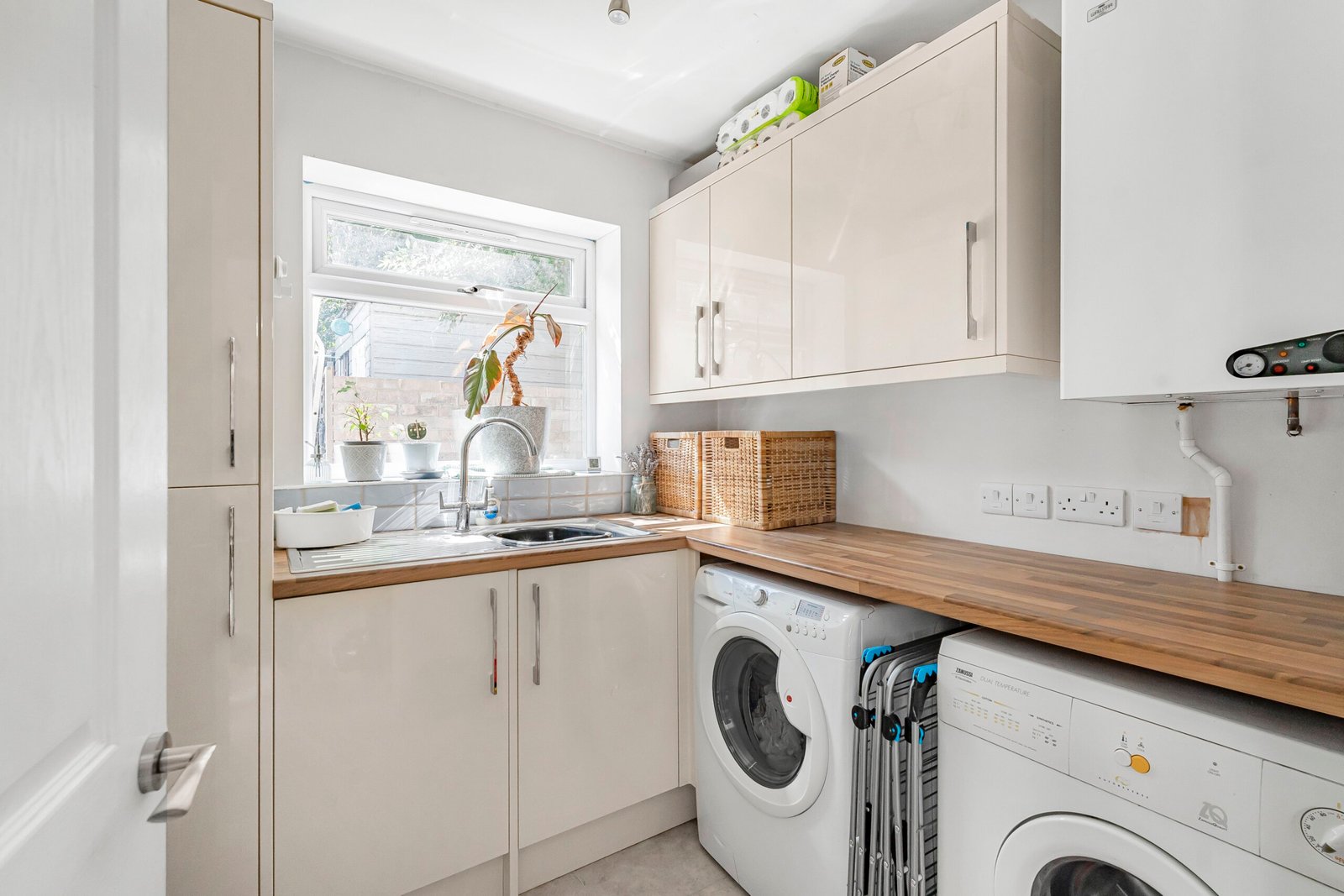 Window to the rear aspect, built in eye and base level units, counter with inset stainless steel sink and drainer with chrome mixer tap over, space for a washing machine and tumble dryer