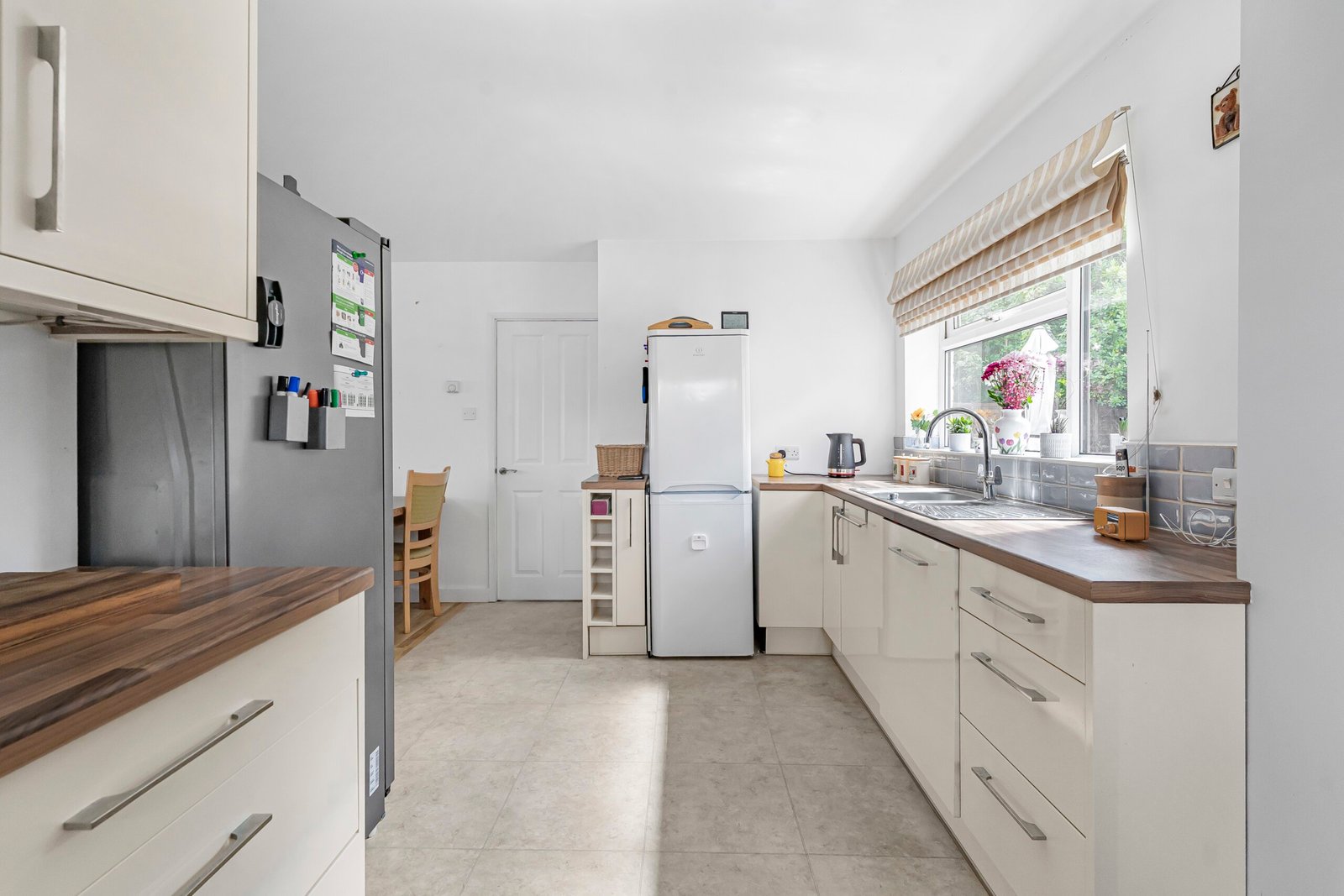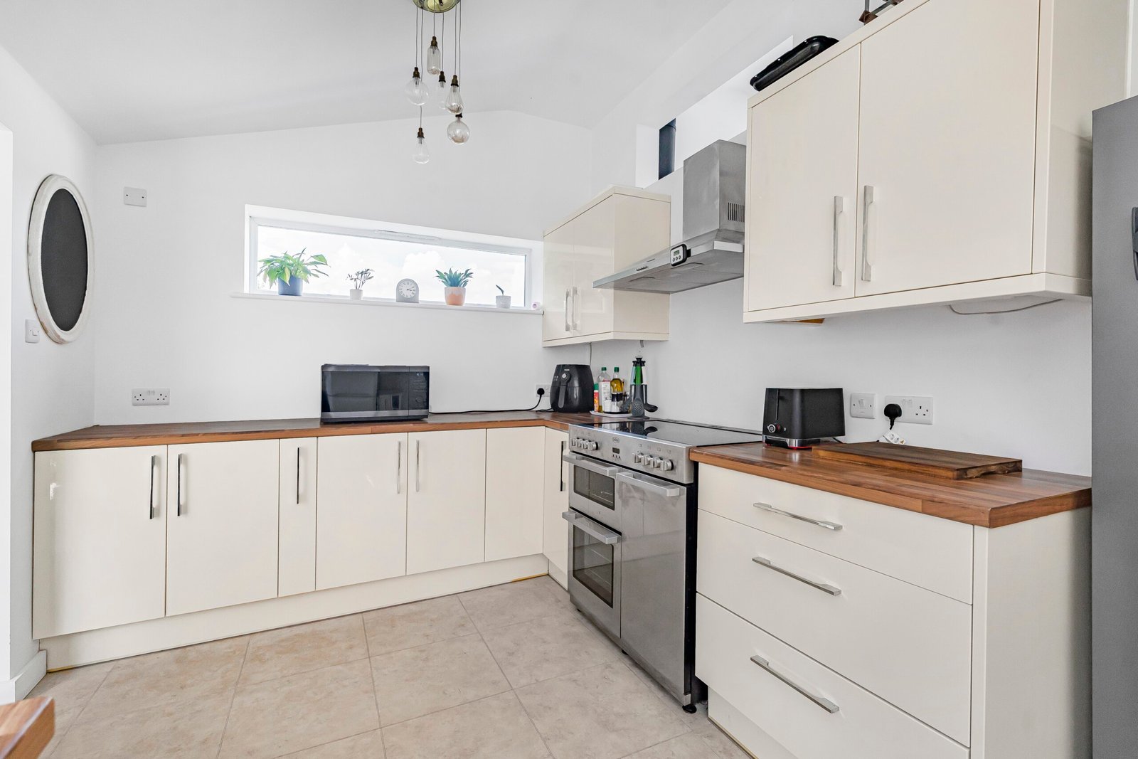 Window to the side and rear aspect, range of matching eye and base level units, integrated dishwasher, Belling range style electric oven with chimney style extractor hood over, oak effect counter with inset stainless steel sink and a half with chrome mixer tap over, freestanding fridge freezer, opening to