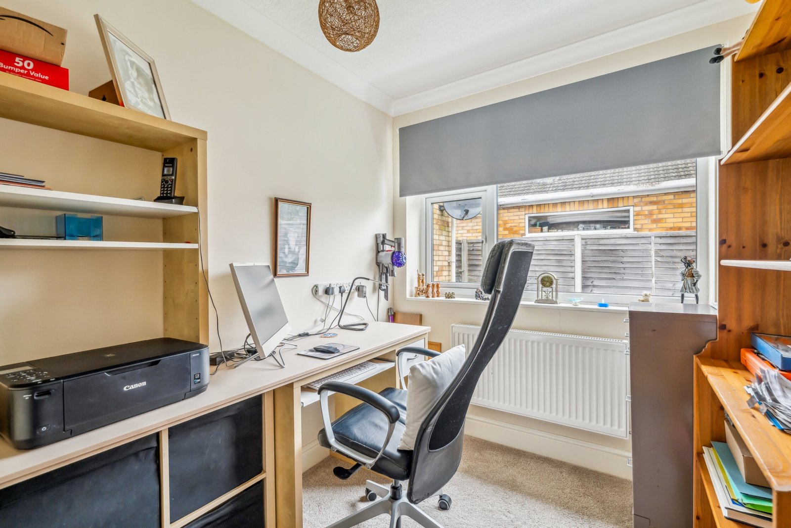 With radiator and storage cupboard.