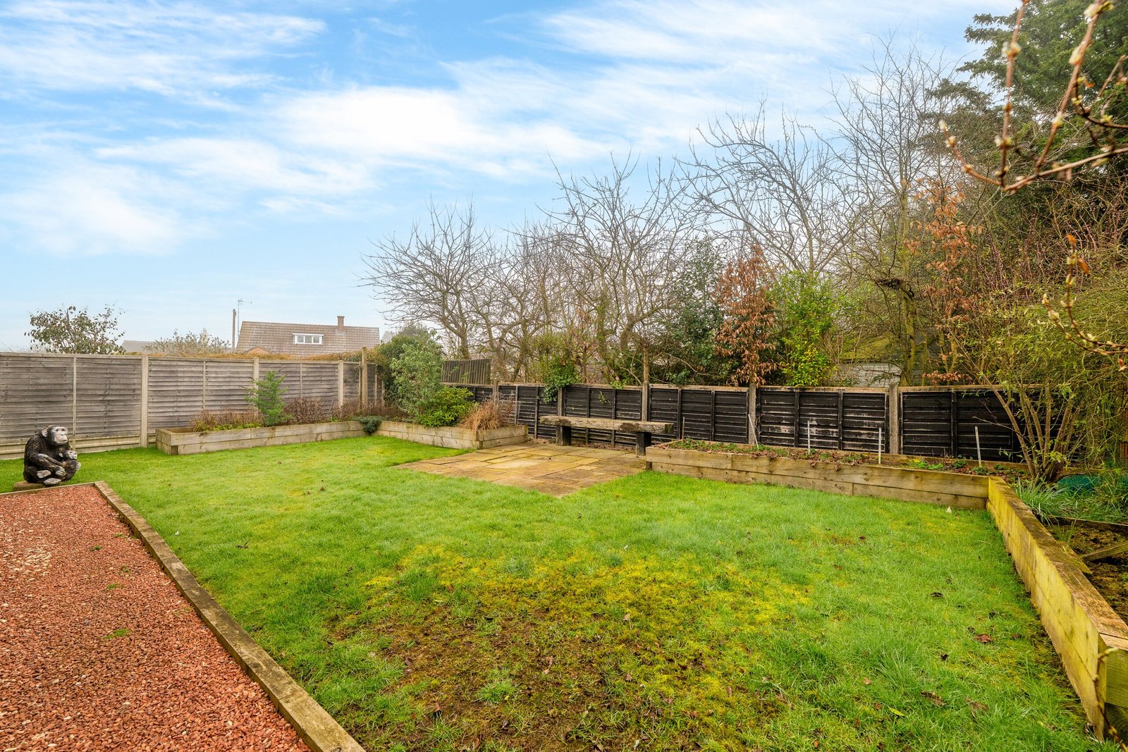 The front elevation offers a generous block paved and gravel driveway leading to an attached garage. The rear garden is mainly laid to lawn with a patio area, a seating area, plants and fenced borders.