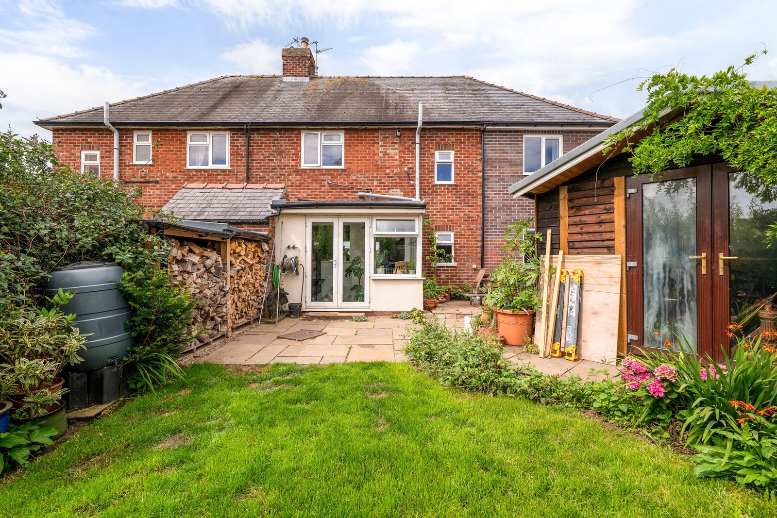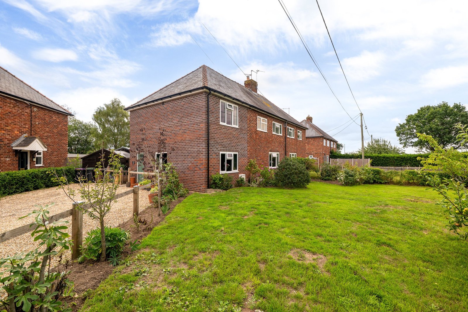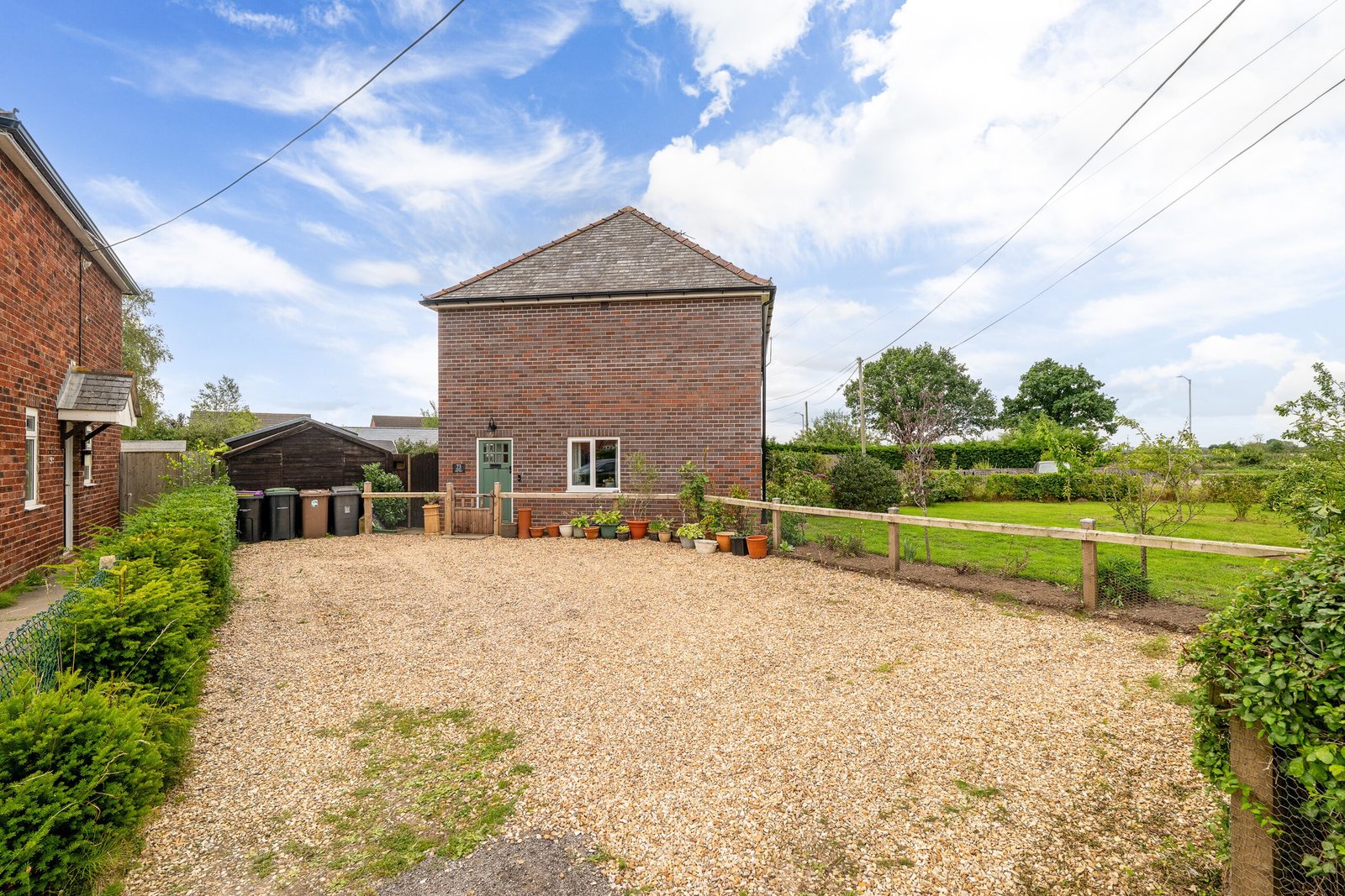 The property sits in a generous corner plot of around 0.16 of an acre with a large gravel driveway, lawned gardens, patio and timber outbuilding.