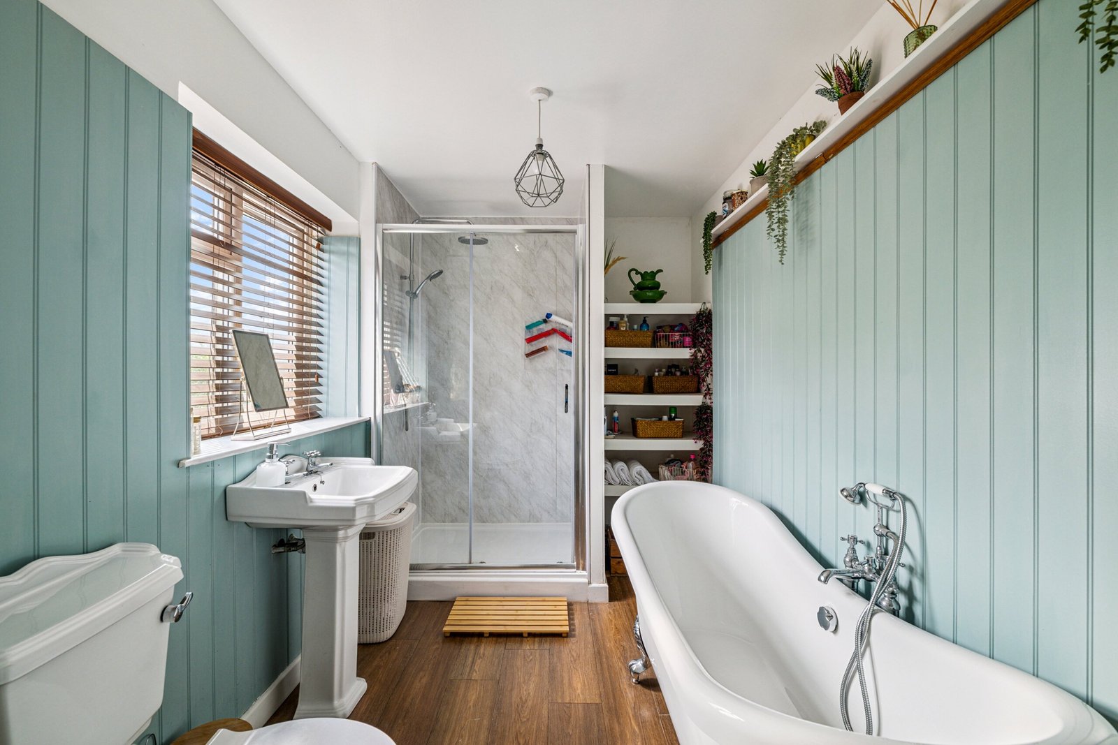 Double glazed casement window to side elevation, four piece suite comprising roll top bath with shower mixer tap, mid flush wc, pedestal wash basin, shower cubicle with dual shower head, heated towel rail, airing cupboard housing, boiler, extractor.
