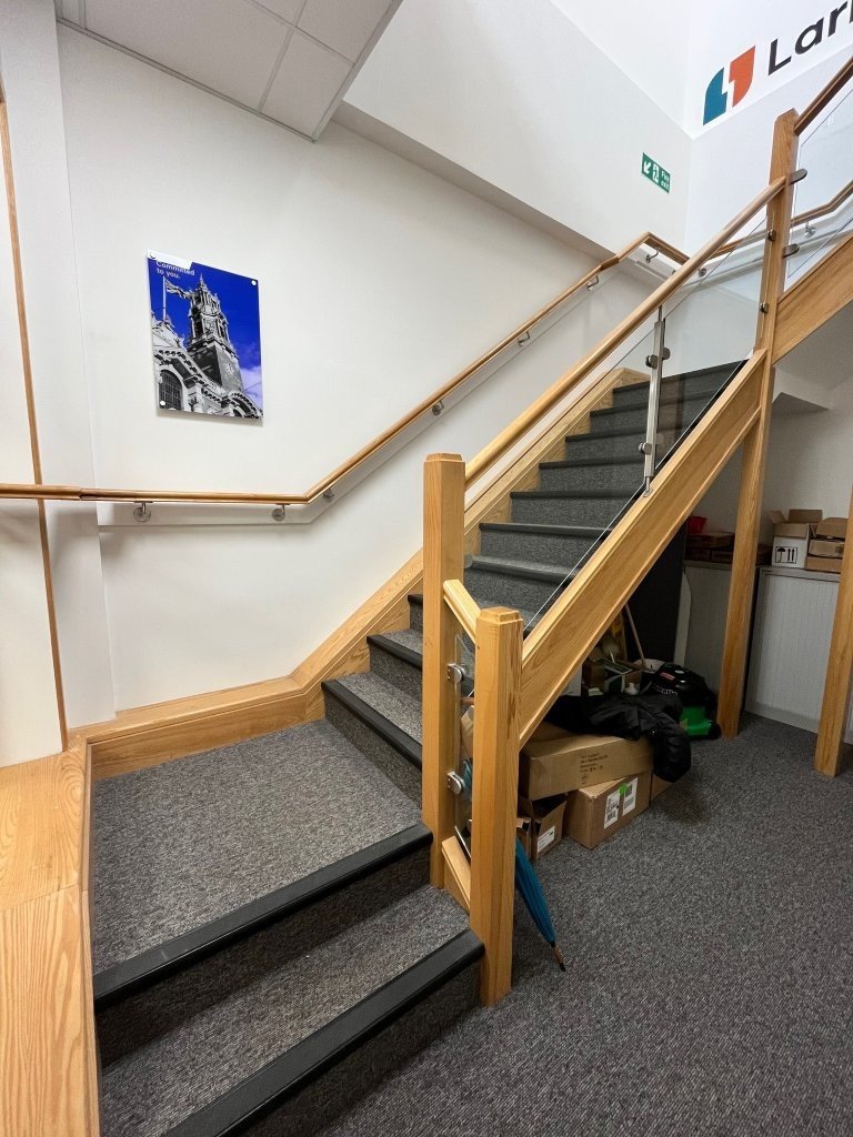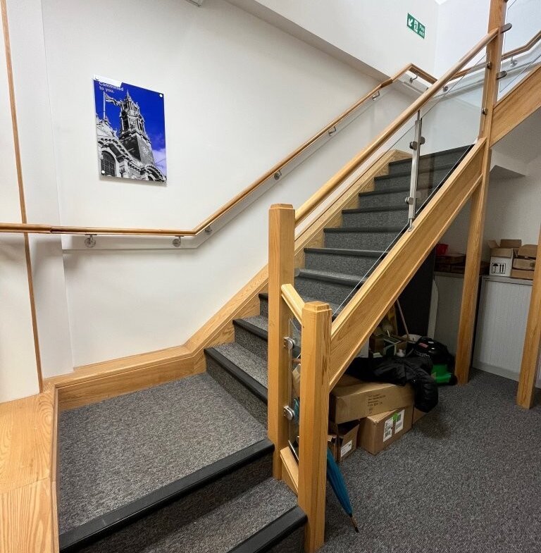 The suite is located on the first floor and is accessed via stairs, offering a predominantly open-plan layout. There is a reception area, tea station and breakout space, two large meeting rooms, a smaller room, and a generous store room.