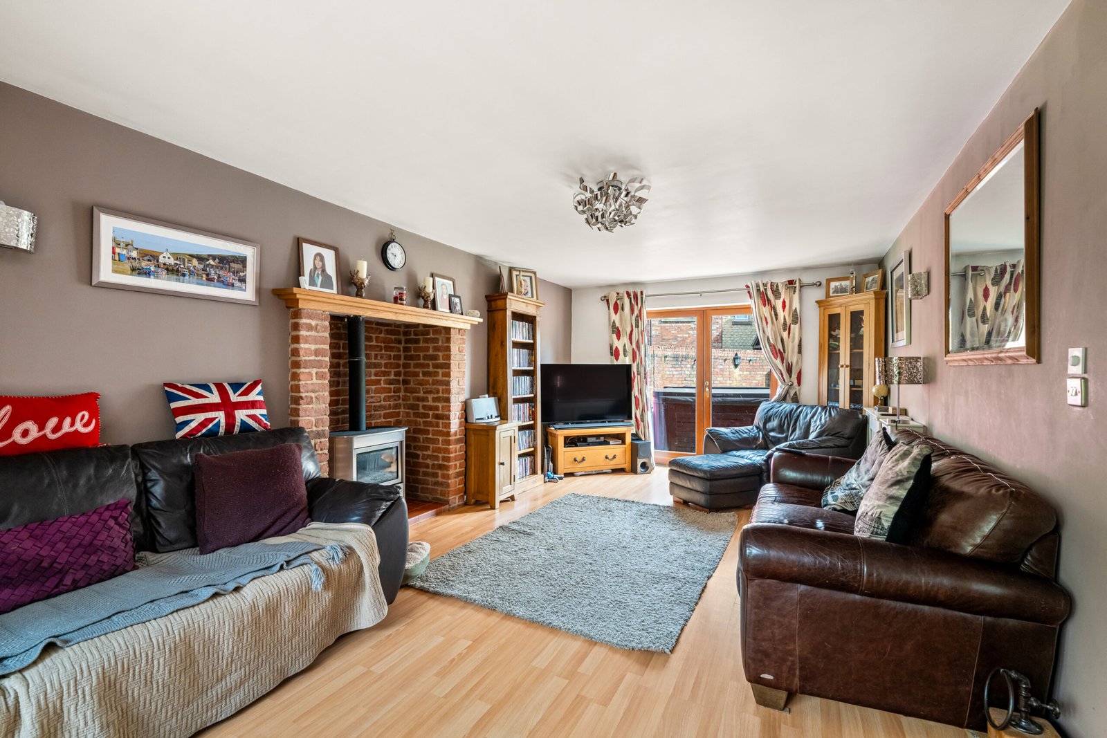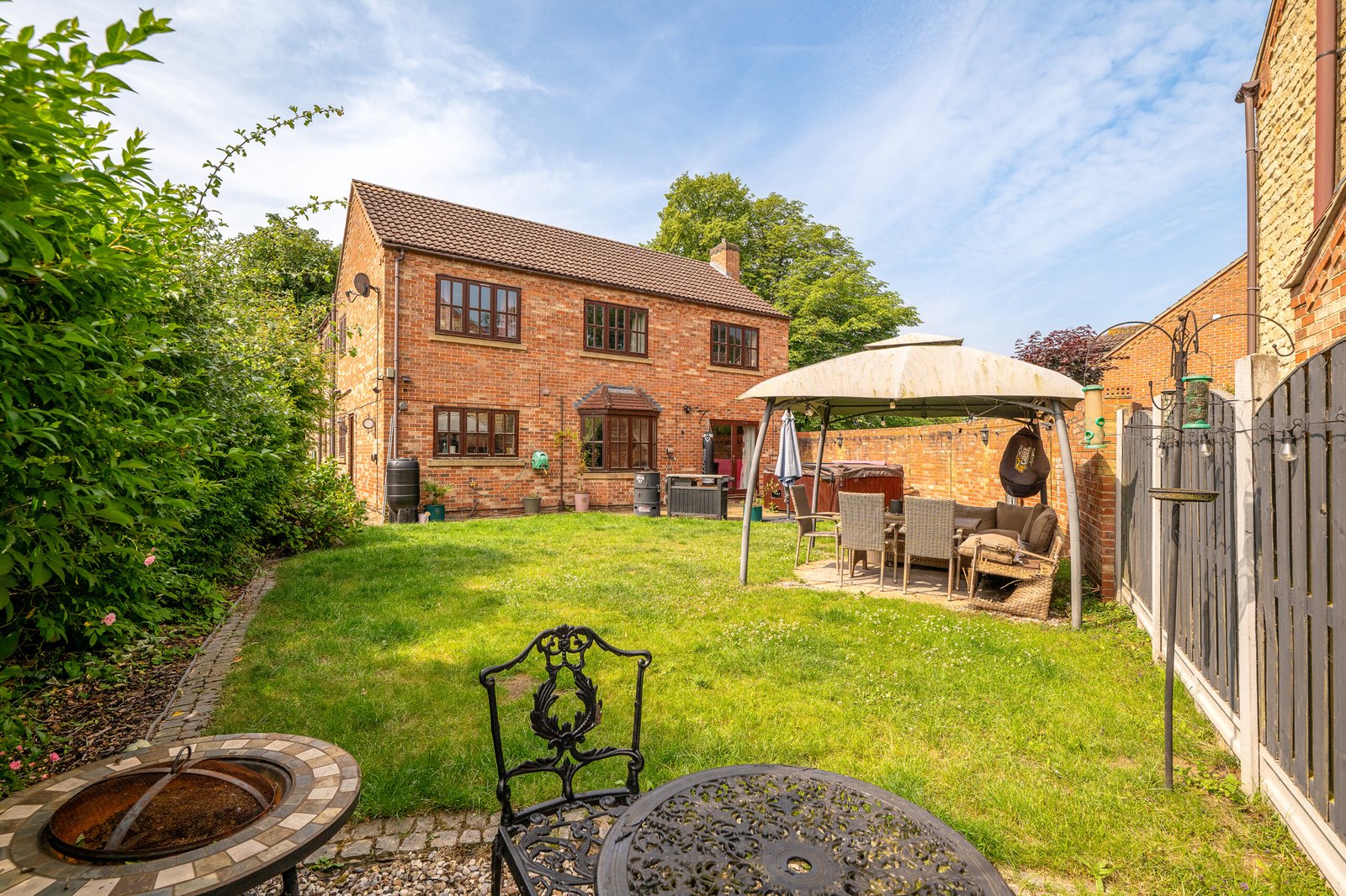 To the rear is an enclosed lawned garden with two patio areas and hot tub.