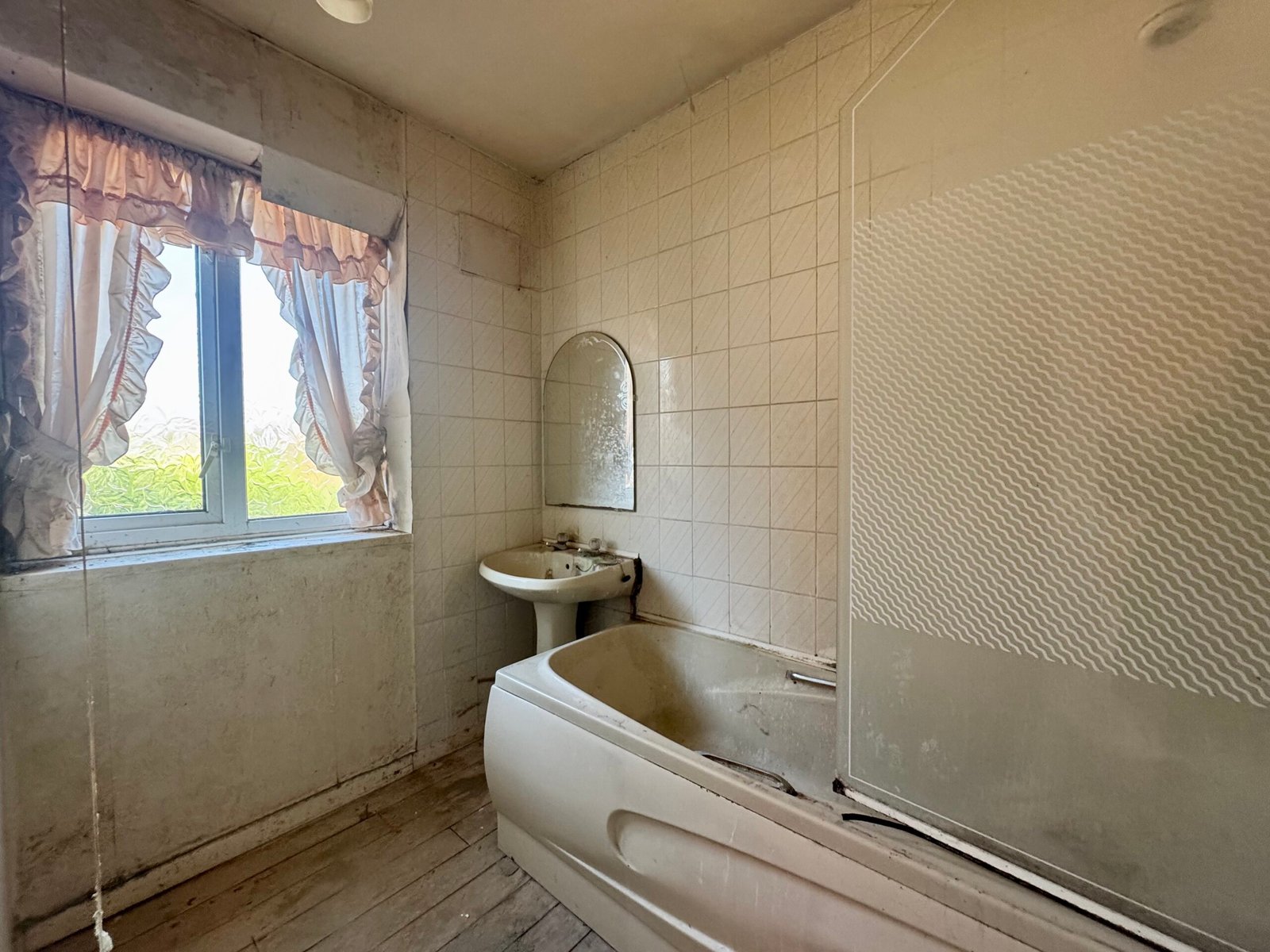 Bathroom: White obscure glazed uPVC window, two piece suite comprising bath and pedestal basin.