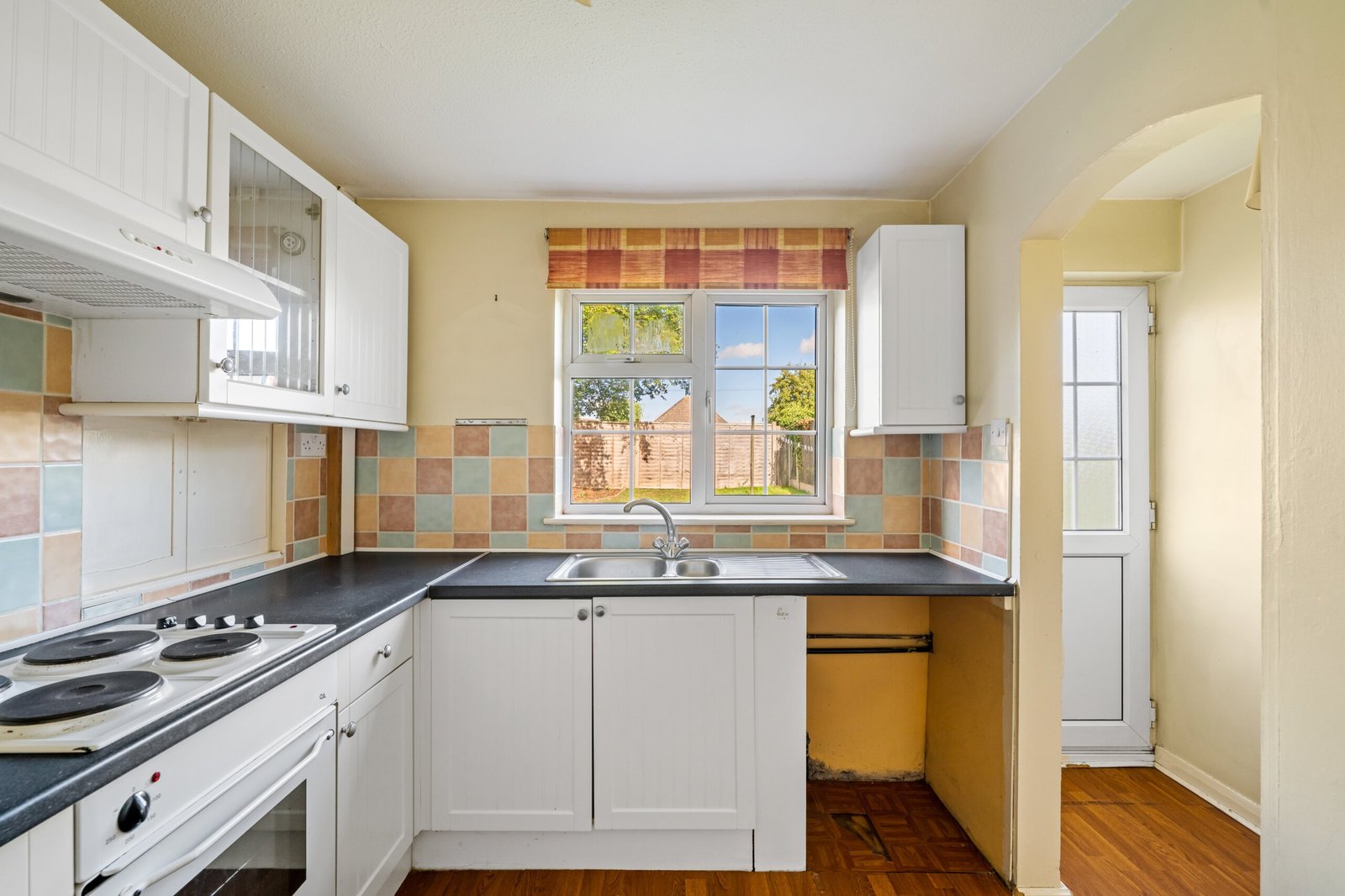 Double glazed window to rear, one and a half stainless steel drainer sink, worktops, base and eye level storage units, integrated oven and hob, spaces for washing machine and fridge freezer, tiled splash backs, archway opening to: