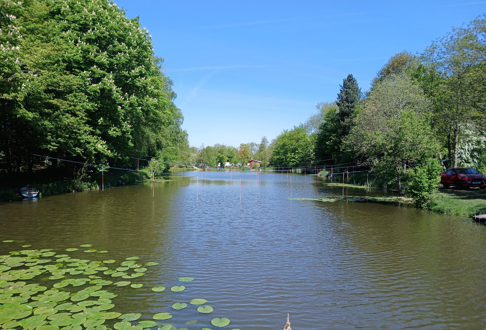 Barbel Pond - extending to 1.08 acres, 19 pegs, with average depths of 5ft. Stocked with carp up to 23lbs, perch, roach, bream, tench, barbel, hybrids and crucian carp.