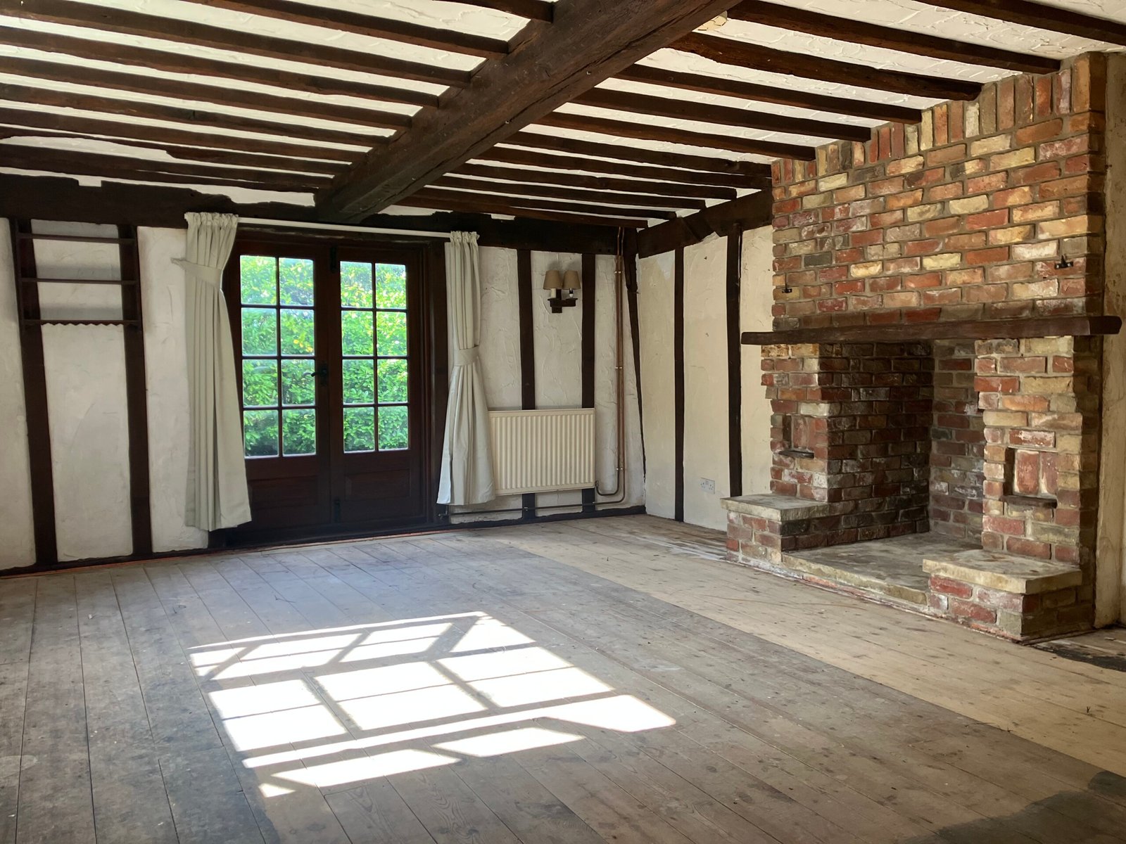 Reception room, accessed from inner hallway with attractive large brick-built fireplace with exposed timber beams and double opening doors into garden.