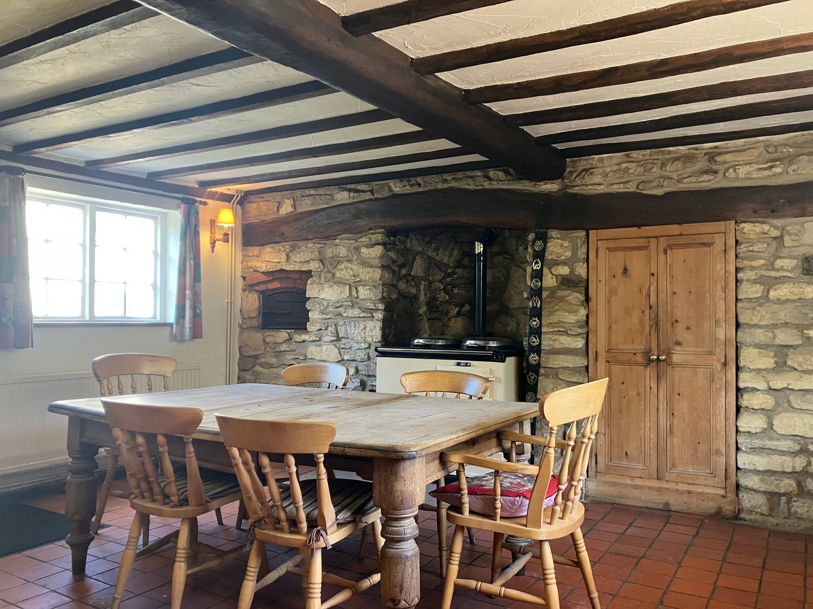 Front door leading into dual aspect farmhouse style kitchen, with central AGA set within feature fireplace, exposed timber beams, traditional tiled floor with built in kitchen units, rear door to private courtyard garden, hallway to sitting room, access to utility and stairs leading to the first-floor bedrooms.