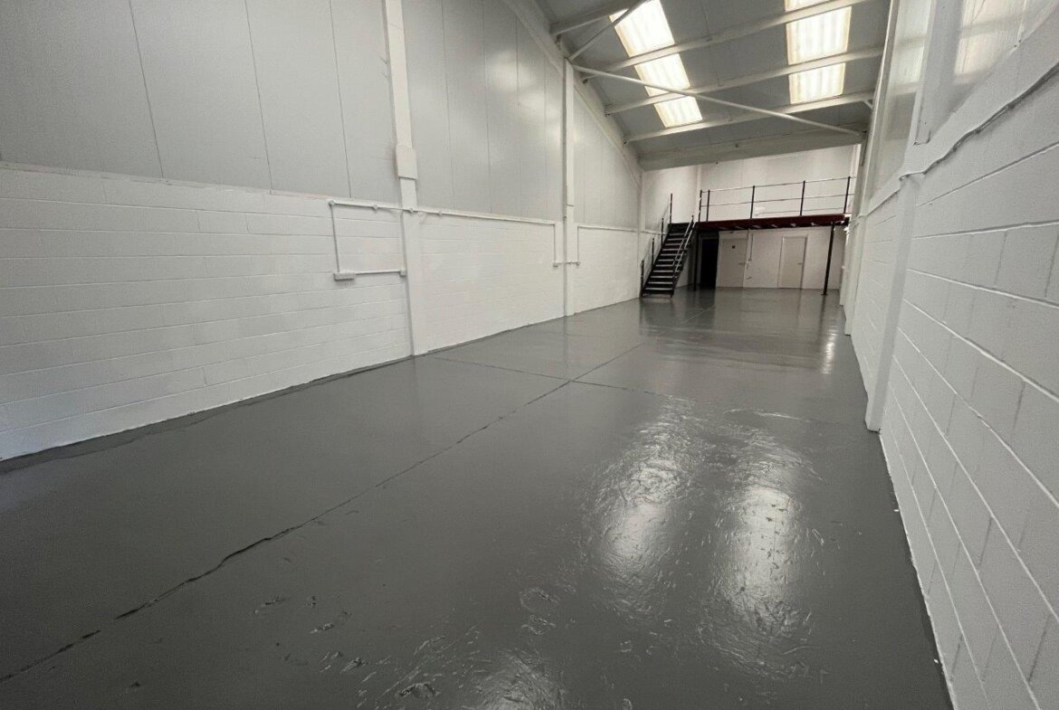 The unit has a minimum eaves height of approx. 4.1m and an apex height of approx. 6.8m. A mezzanine floor (min. eaves approx. 2.4m and apex approx. 3.8m) is accessed via a staircase to the rear of the unit. The under-mezzanine area has a ceiling height of approx. 2.4m.