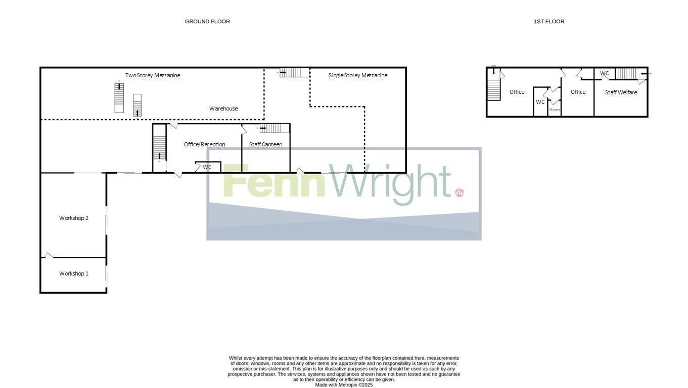 The property comprises an industrial/warehouse building which is split between two workshops and a warehouse. The warehouse is currently fitted out with racking and an extensive mezzanine which is split over the first and second floors. The mezzanine and racking could be removed to provide a clear span warehouse with a minimum eaves height of approximately 5.00m rising to 7.50m at the apex. There are two loading doors to the warehouse (4.00m wide x 5.90m high and 5.50m wide x 4.75m high). At the front of the warehouse is a two storey office section which provides reception, offices, canteen, WC and welfare facilities. The two workshops have a roller shutter access door (Workshop 1 – 4.25m wide x 4.50m high and Workshop 2 – 3.90m wide x 4.75m high) and a minimum eaves height of approximately 3.00m.