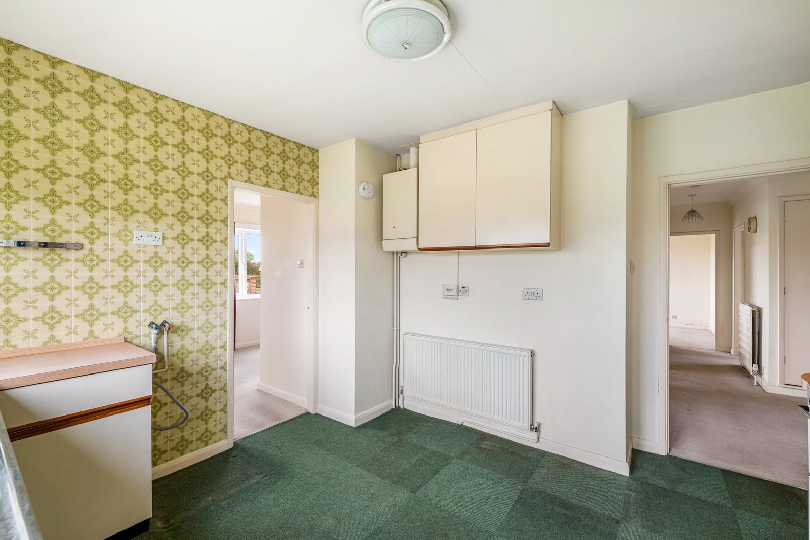 Double glazed casement window to side elevation, fitted wall and base units with stainless steel double drainer sink, space and plumbing for washing machine, built in storage, ideal classic boiler, door to side elevation and door to;