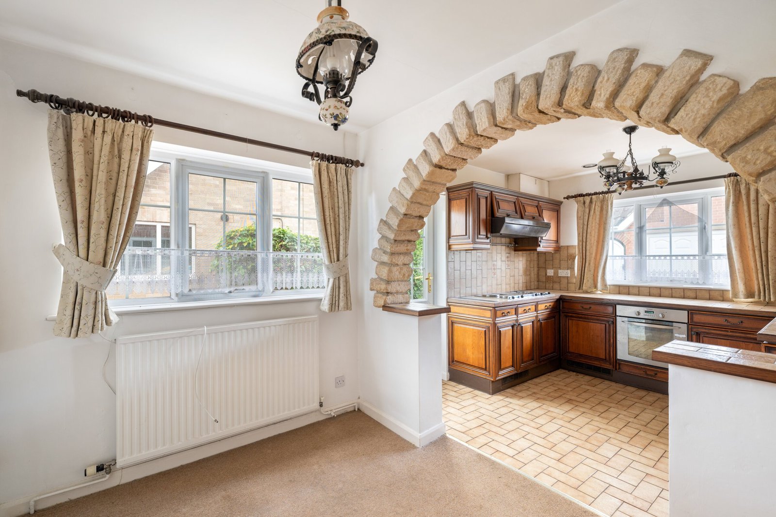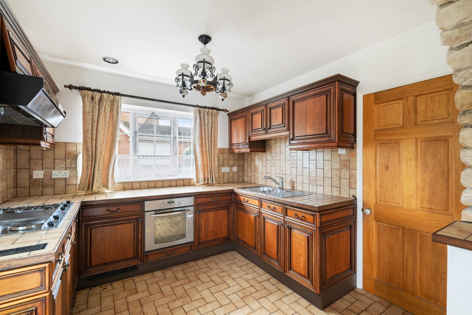 Double glazed window to rear, entrance door to side, one and a half stainless steel drainer sink, worktops, base and eye level storage units, integrated hobs with extractor over, integrated oven, tiled splash backs, tiled flooring, opening into: