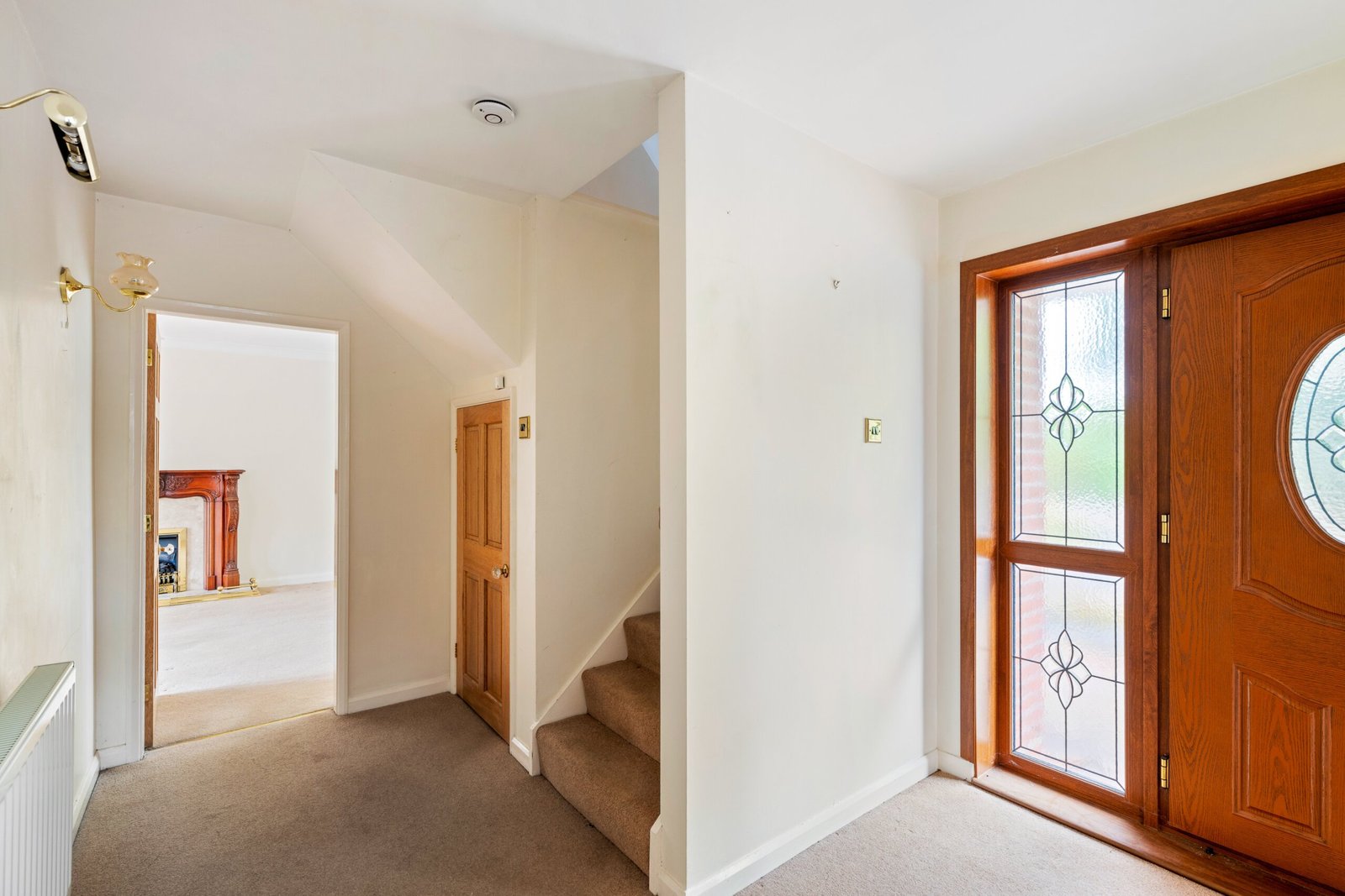 Front entrance door, stairs rising to first floor, under stairs storage cupboard, radiator.