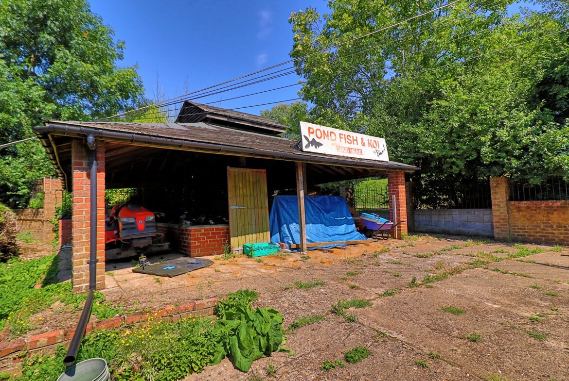 Located between the car park and the lakes is a former fish house building containing recirculation tanks and kitchen/retail area, together with a large pagoda and greenhouses.