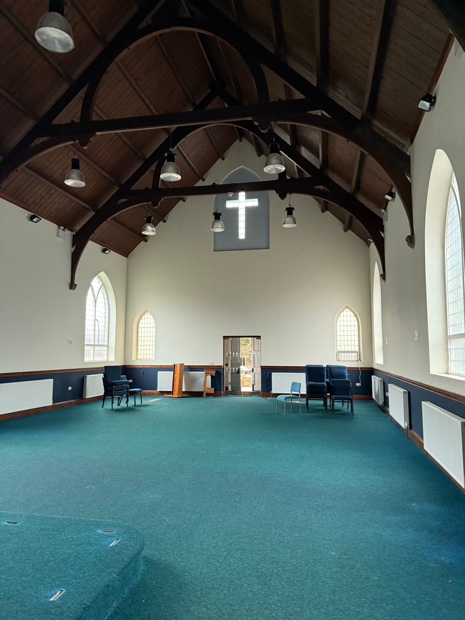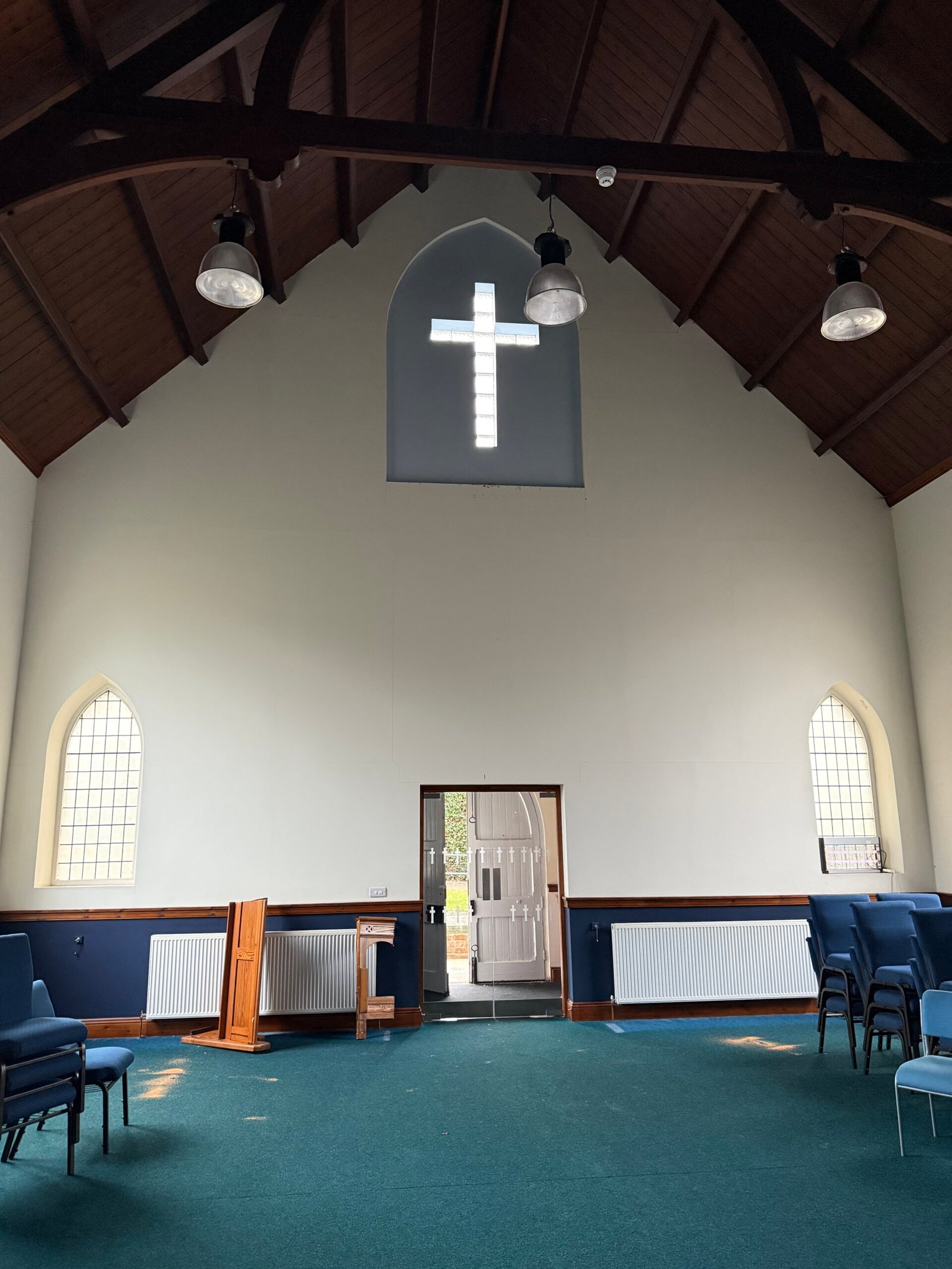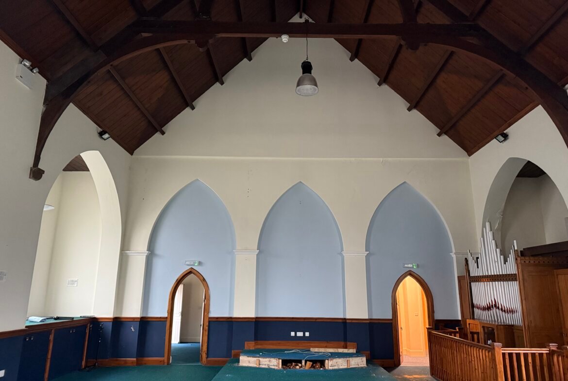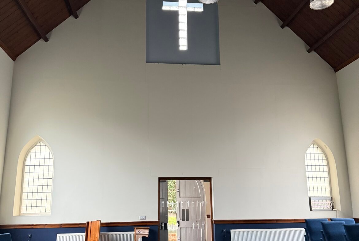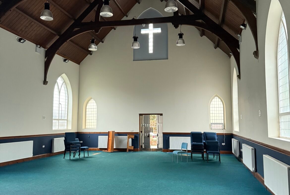 Built in 1913, the church is of brick construction beneath a pitched slate roof. It has arched windows with decorative sandstone detail. The main entrance is ramp-accessible, leading to a small porch with glass doors opening into the Church Hall. A kitchen and WCs flank the altar, with steps from the kitchen to the rear and side passage for basement access. Outside, there's a small service yard on the west side for refuse management.