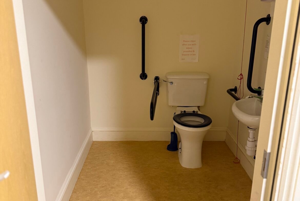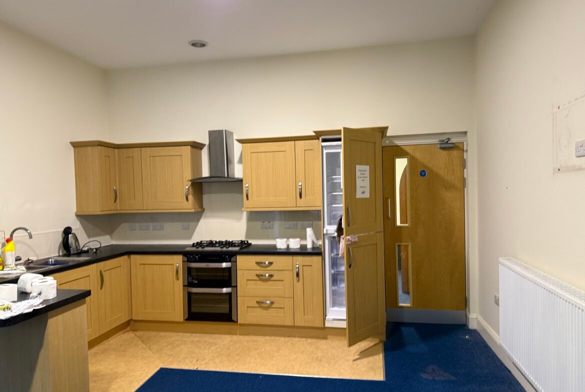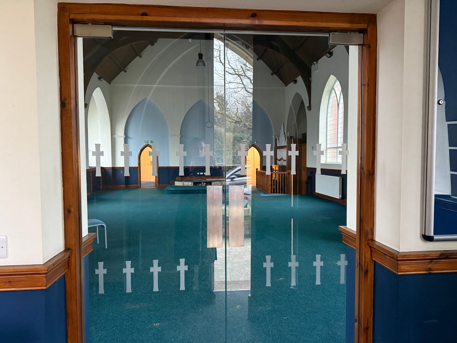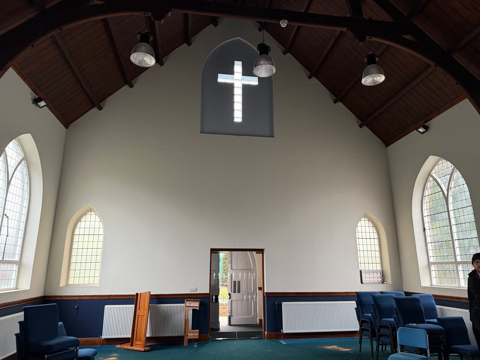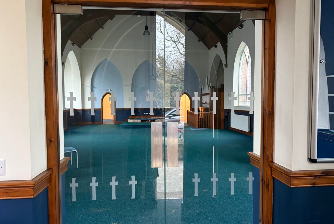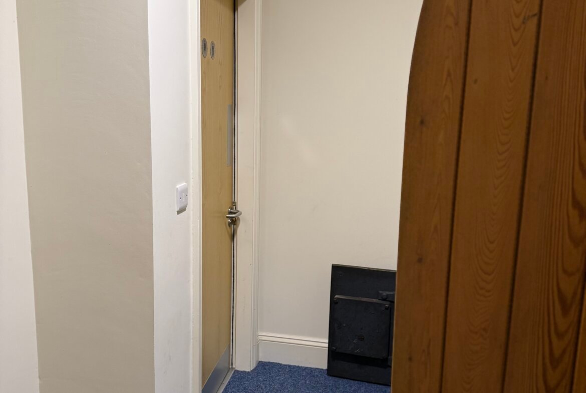 Built in 1913, the church is of brick construction beneath a pitched slate roof. It has arched windows with decorative sandstone detail. The main entrance is ramp-accessible, leading to a small porch with glass doors opening into the Church Hall. A kitchen and WCs flank the altar, with steps from the kitchen to the rear and side passage for basement access. Outside, there's a small service yard on the west side for refuse management.